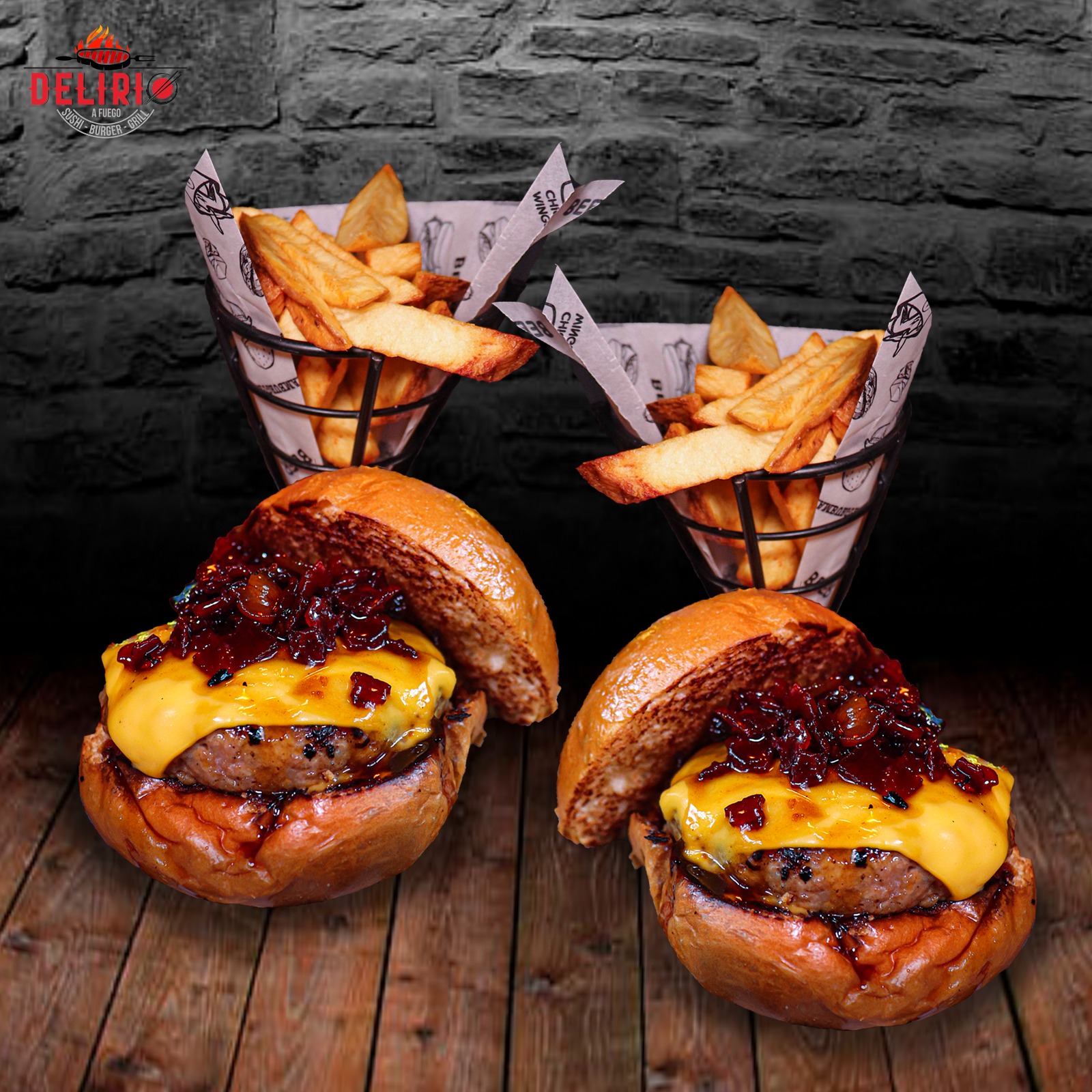 dos hamburguesas de pan artesanal tipo brioche de origen francés 150 gr de carne de la casa 100% cerdo rellena de queso americano y cubierta de queso americano mermelada de tocineta 80 gr de papas
