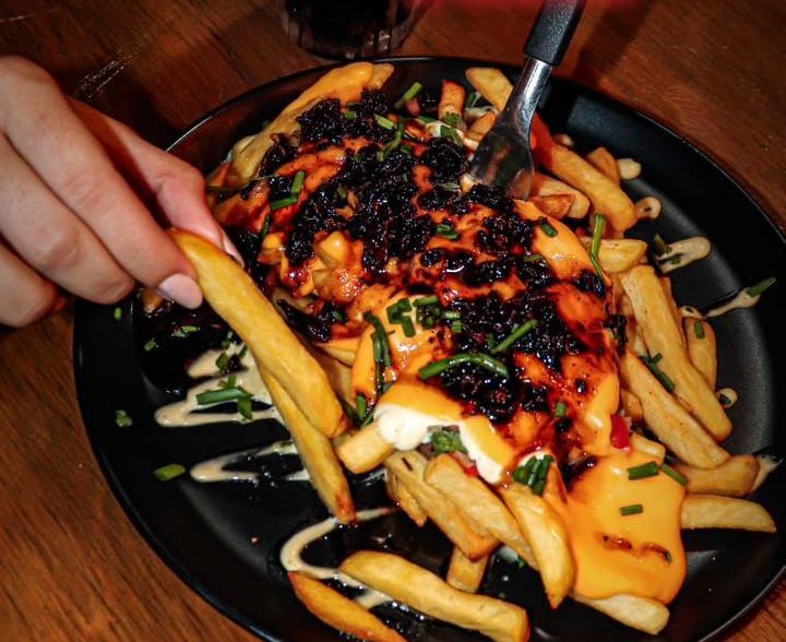 Papas a la francesa, pico de gallo, sour cream cremoso de la casa bañado en fusión de queso cheddar americano y finalizado en mermelada de tocineta y cerveza Club Colombia Negra con aroma de café.