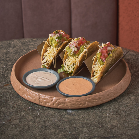 Trio de tacos acompañado con guacamole, frijoles refritos, queso, salsas de la casa, lechuga chifonada y pico de gallo mexicano con proteína a elección.