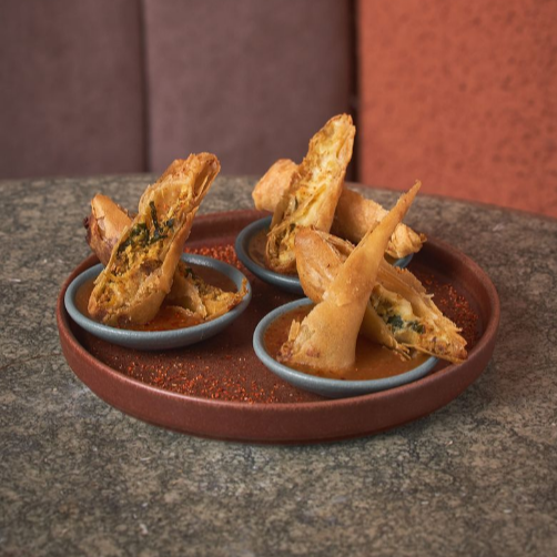 Rollitos de masa oriental rellenos de pollo, queso y albahaca salteados en curry, acompañados en salsa agridulce.