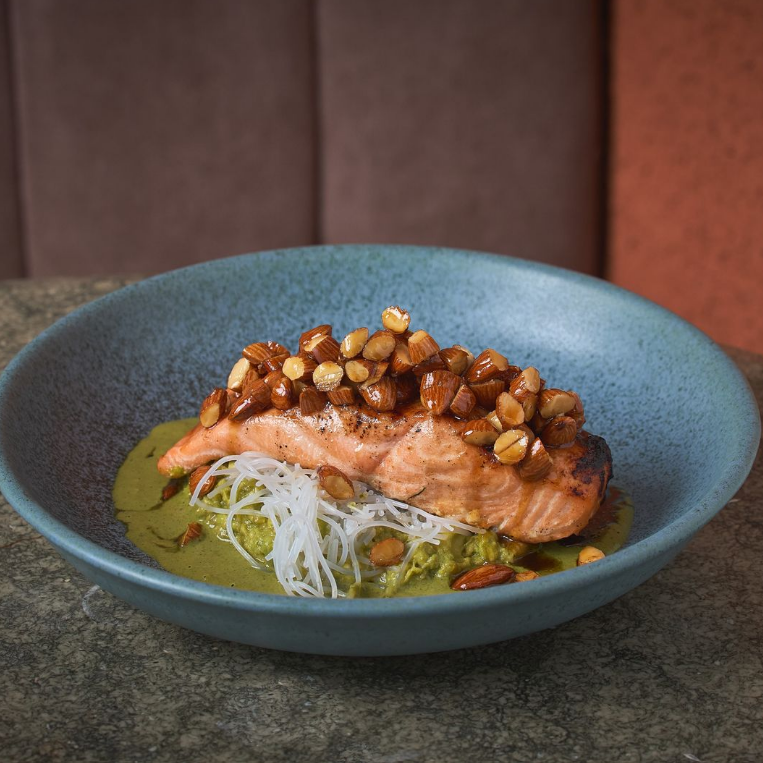 Salmón a la parrilla con almendras garrapiñadas, sobre una cama de pasta vermicelli, aguacate y salsa de base de cilantro.