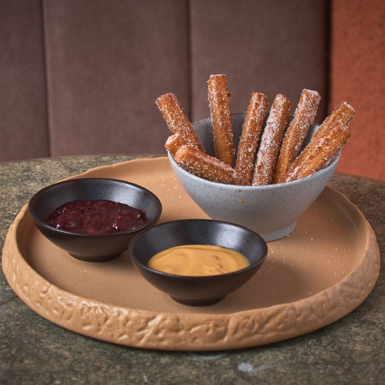 Churros crocantes bañados en azúcar con salsas de arequipe y frutos rojos.