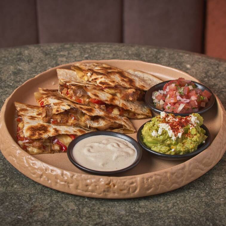 Triángulos de tortilla de harina tostada con queso delirio fundido, acompañado con salsa de la casa, pico de gallo y guacamole. Elige la proteína: Birria- Pollo Parrillado con pimentón- Cerdo al pastor con piña. Contiene cebolla