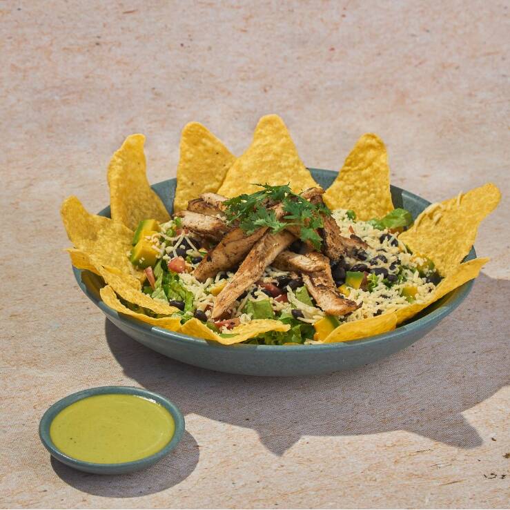 Pollo a la parrilla (90g) con arroz yakimeshi, lechuga fresca, queso Delirio, guacamole cremoso, pico de gallo y frijol negro, acompañado de salsa chipotle y sour cream.