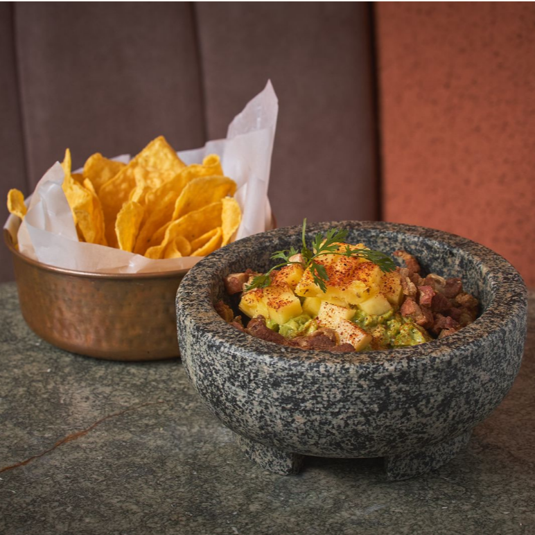 Molcajete de frijoles refritos cremosos, chicharrón, gratinados al horno y bañados en salsa de la casa, con guacamole rústico y pico de gallo mexicano acompañado de totopos con una proteína a tu elección.