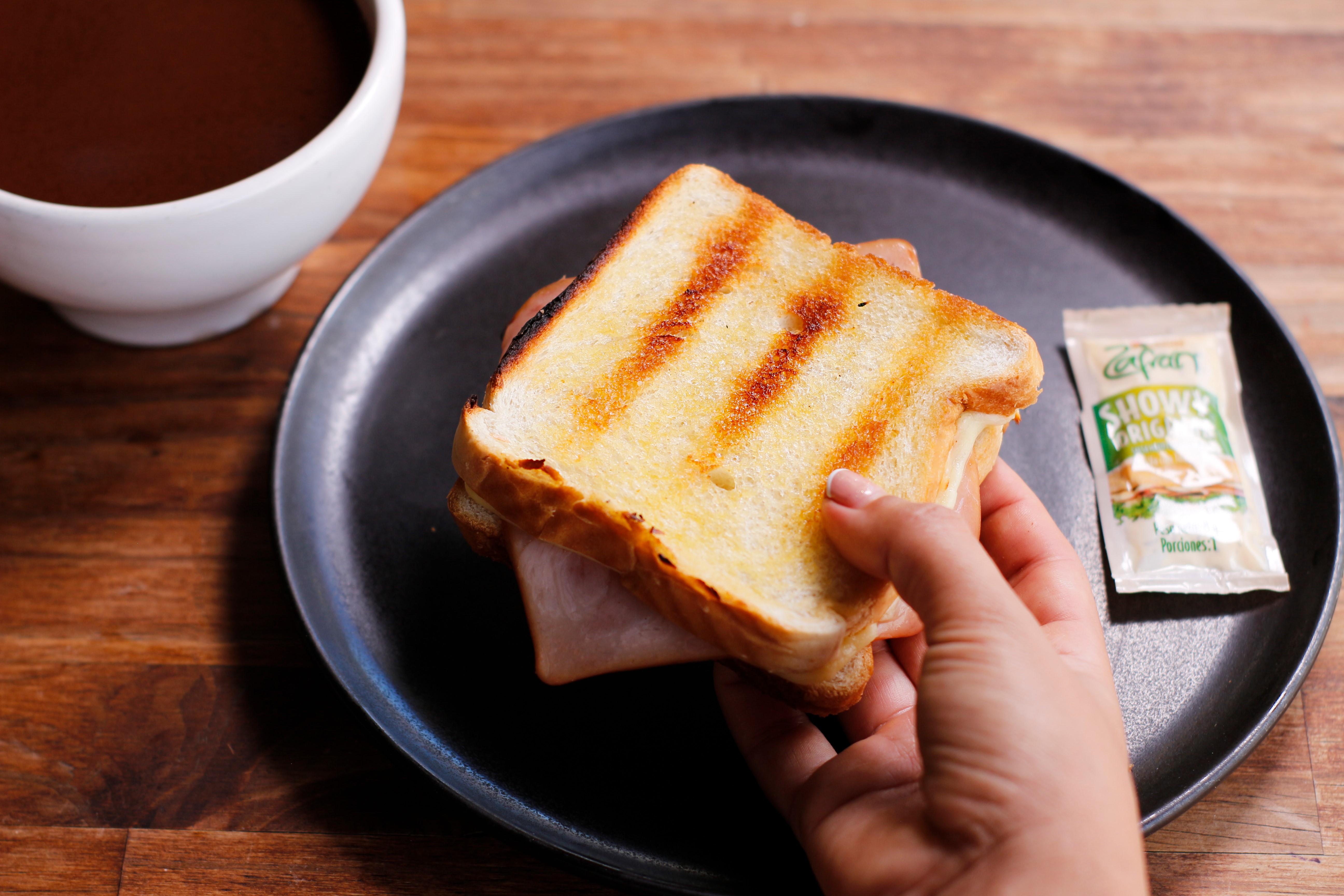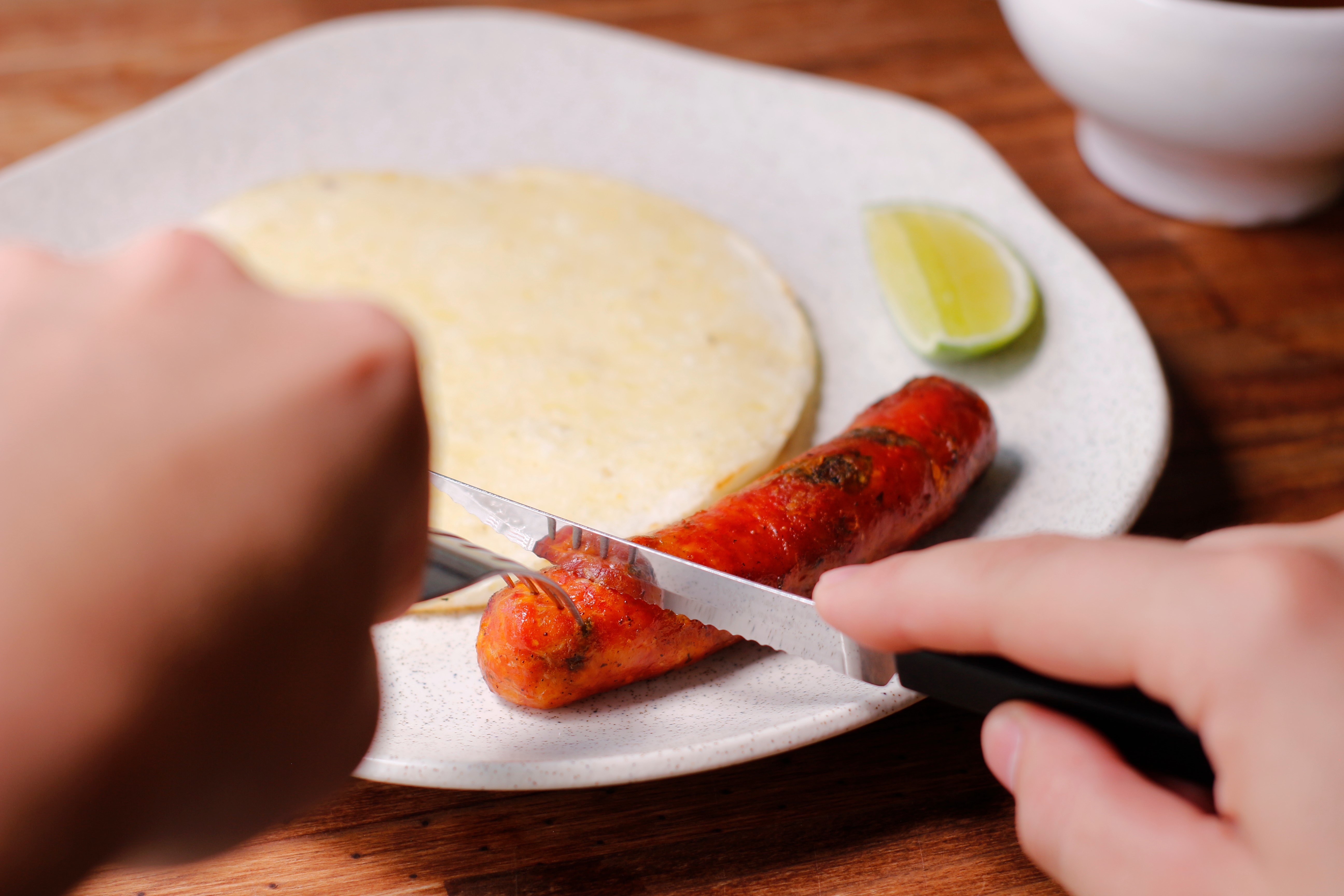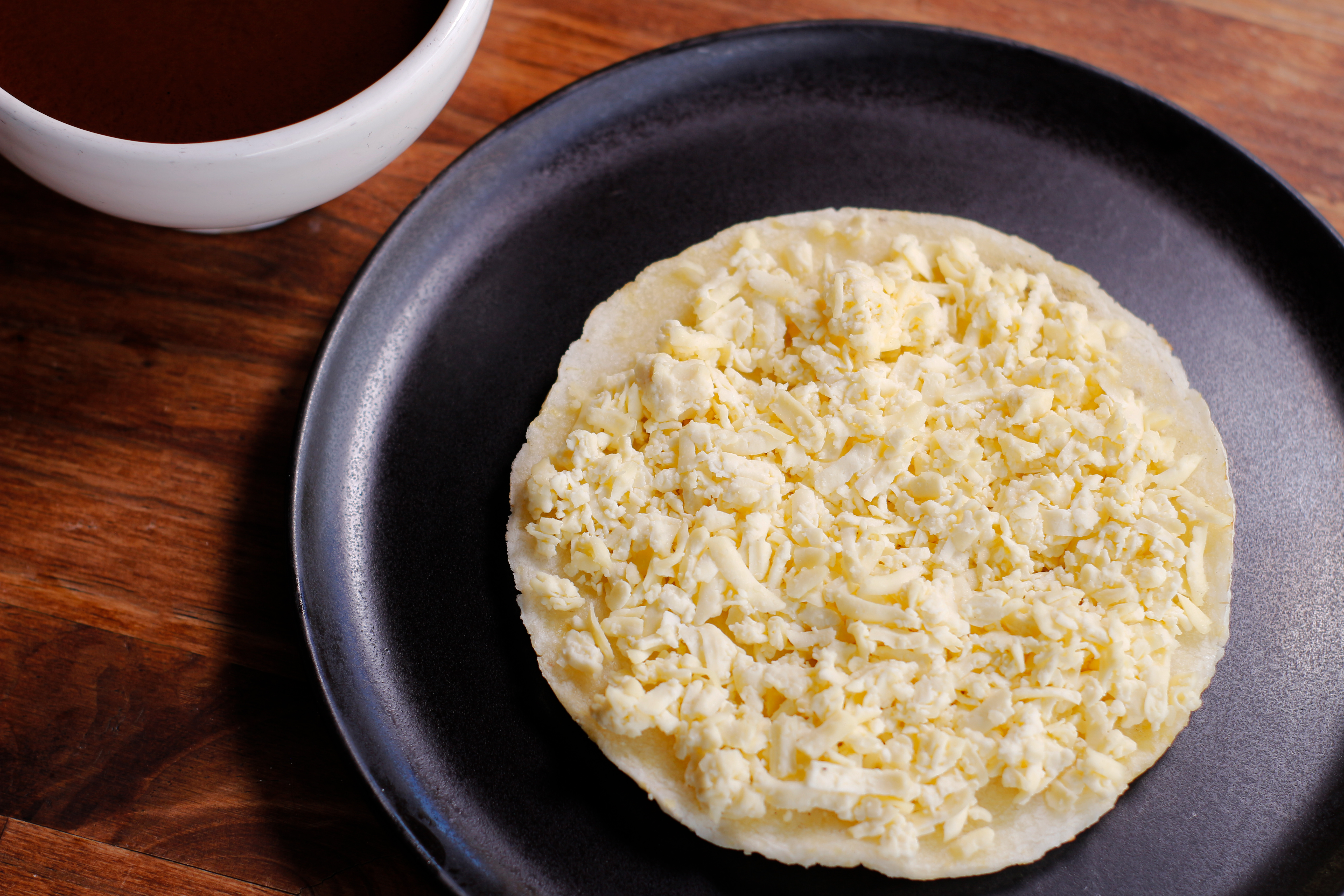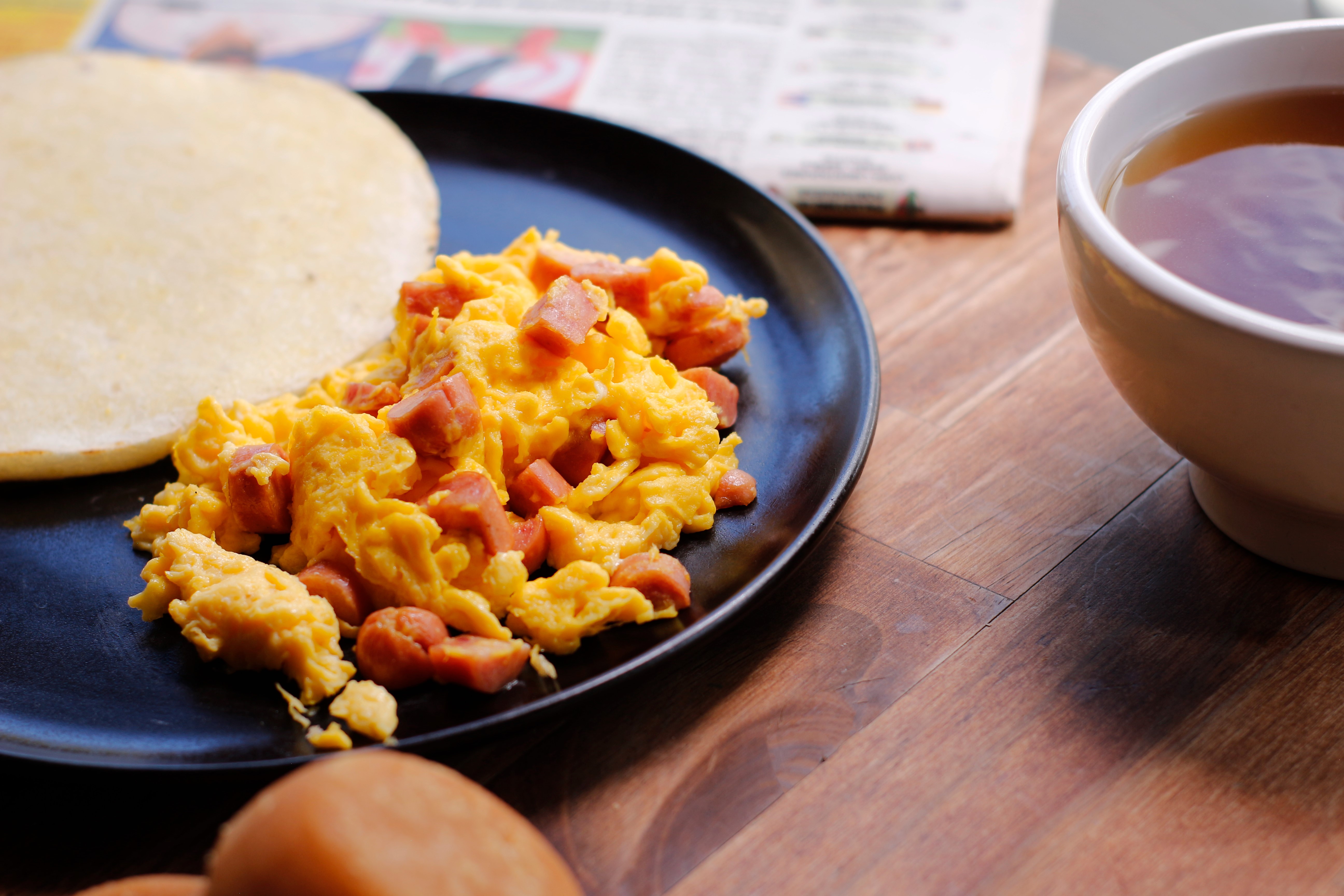 arepa de maiz, quesito , huevos revueltos , chorizo y chocolate
