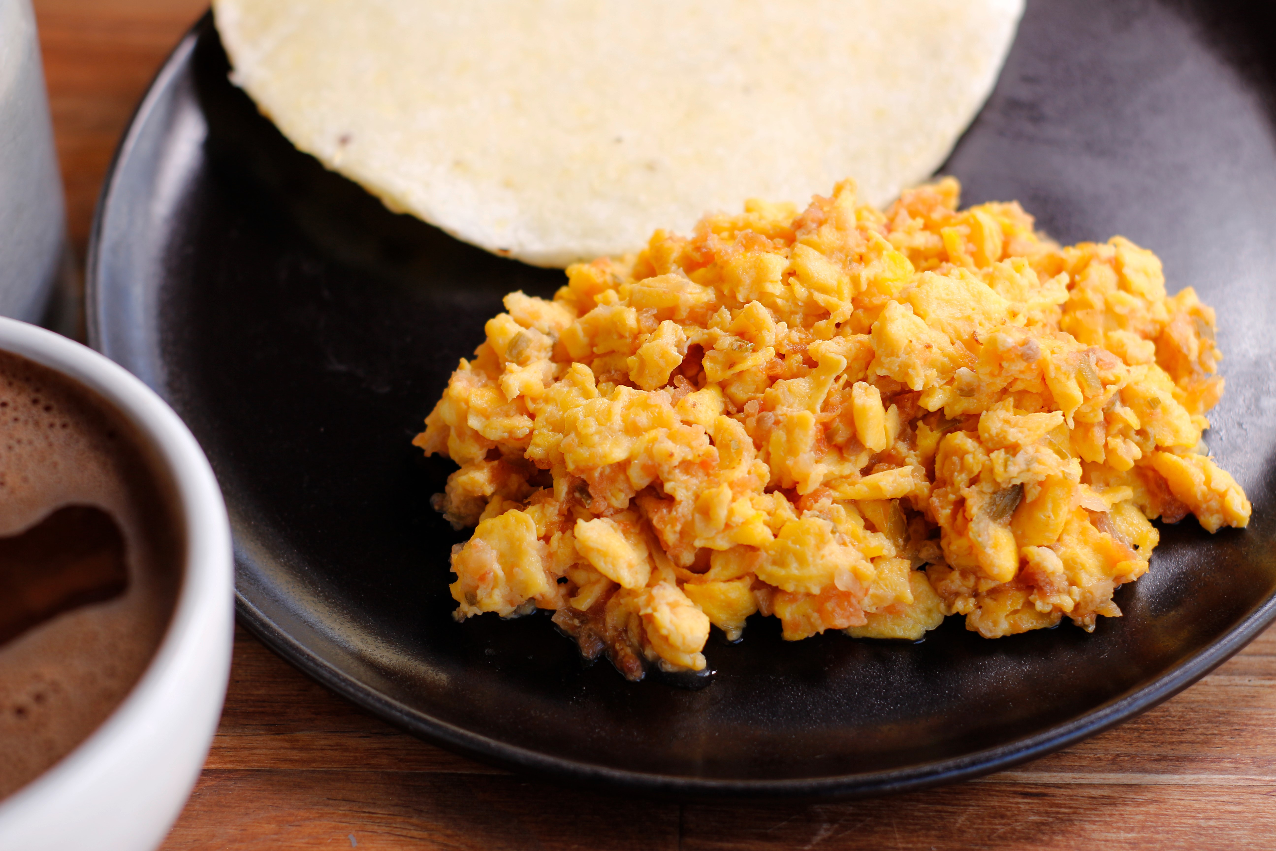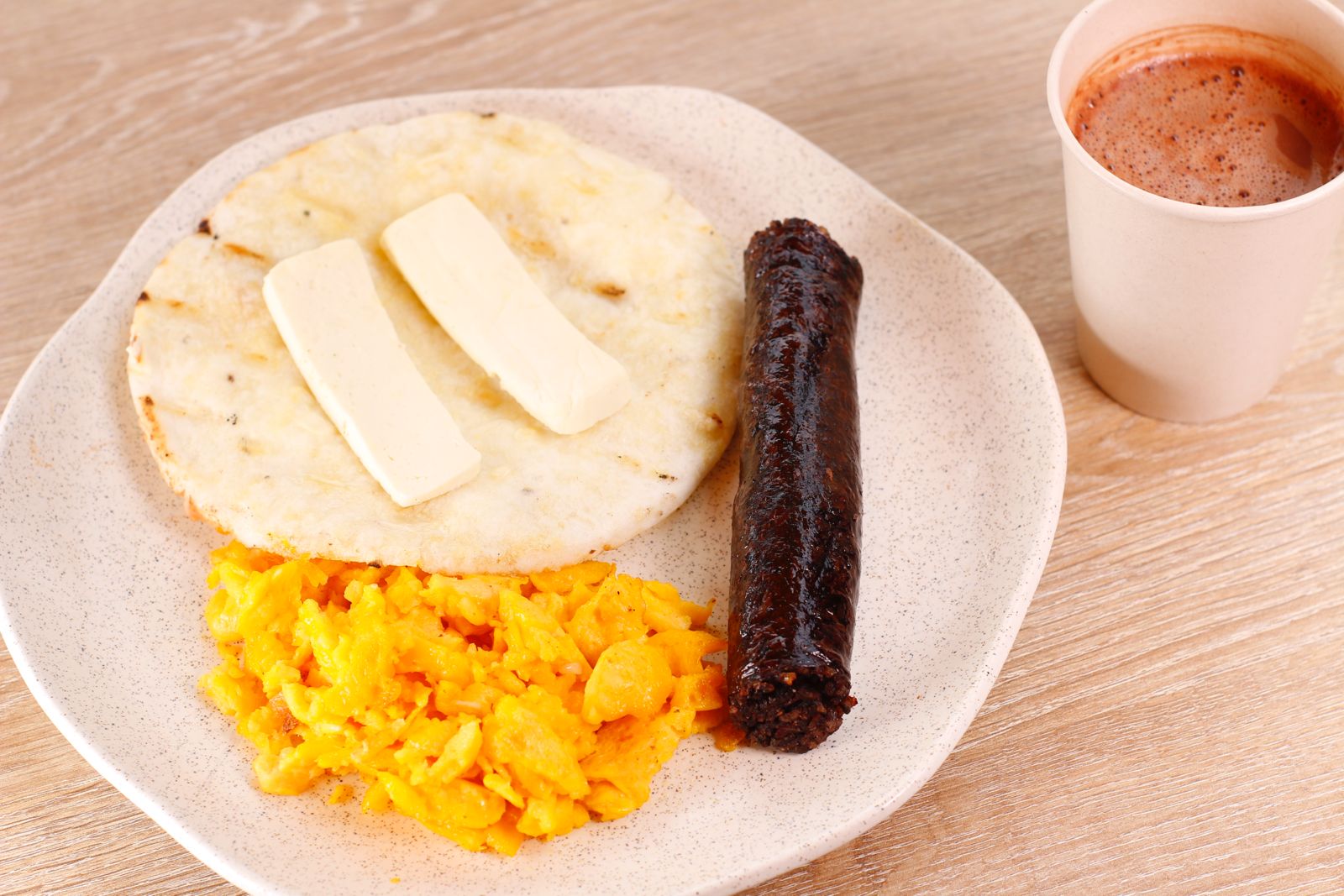 Arepa con quesito , huevos revueltos, morcilla y chocolate