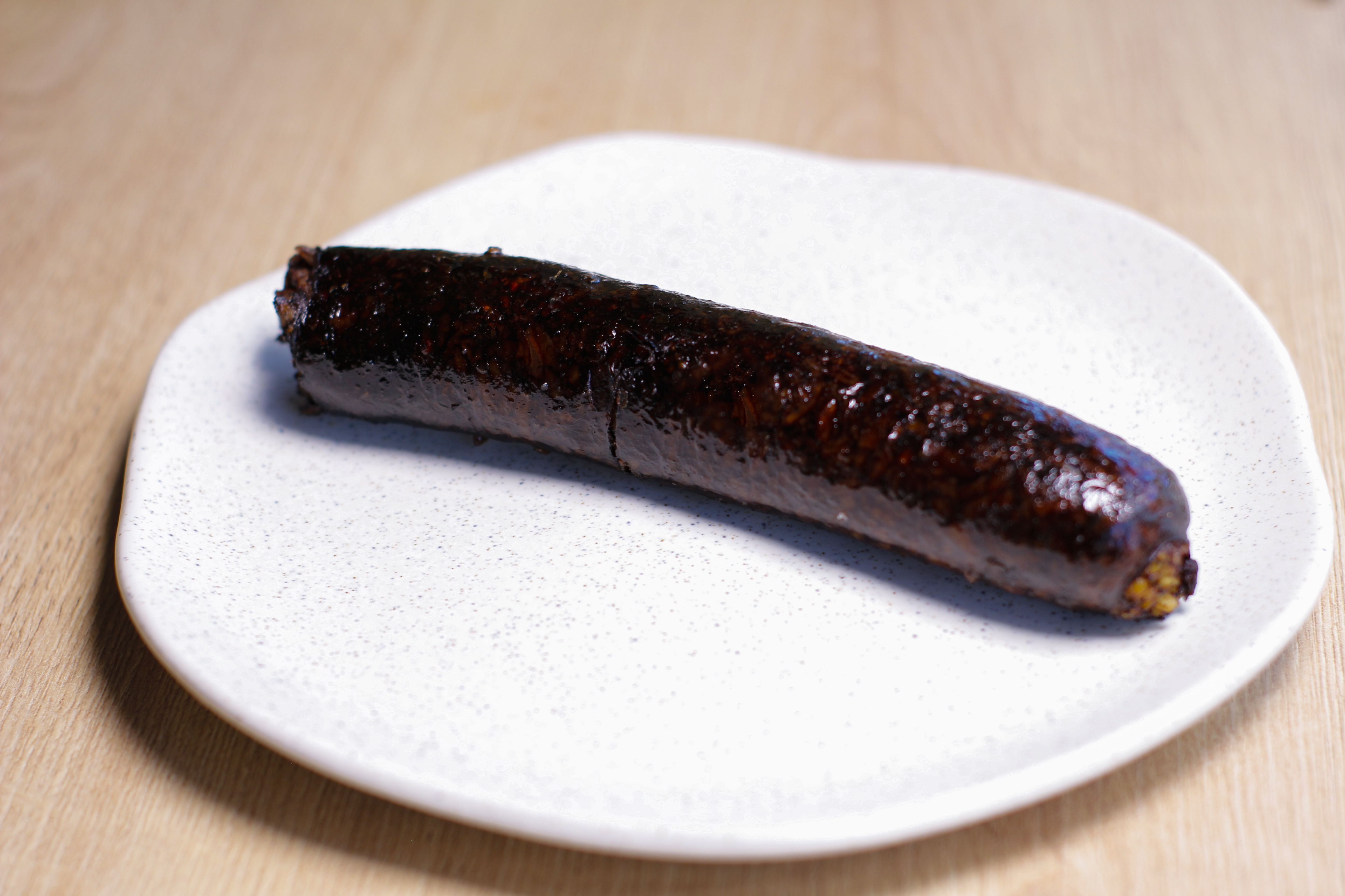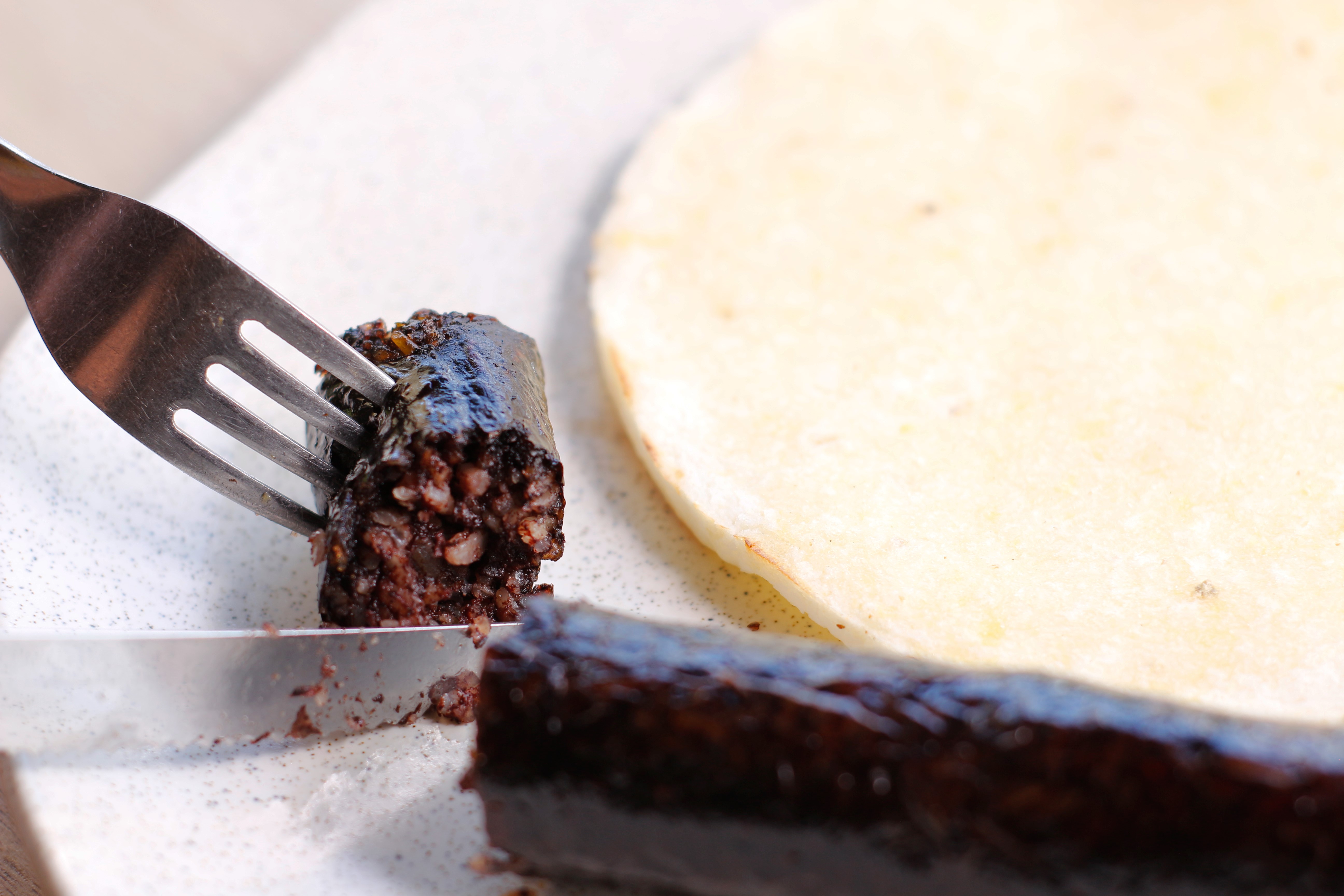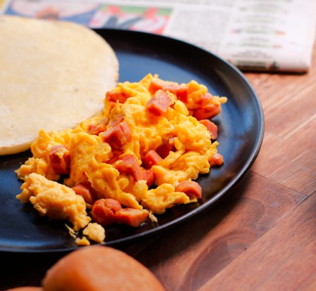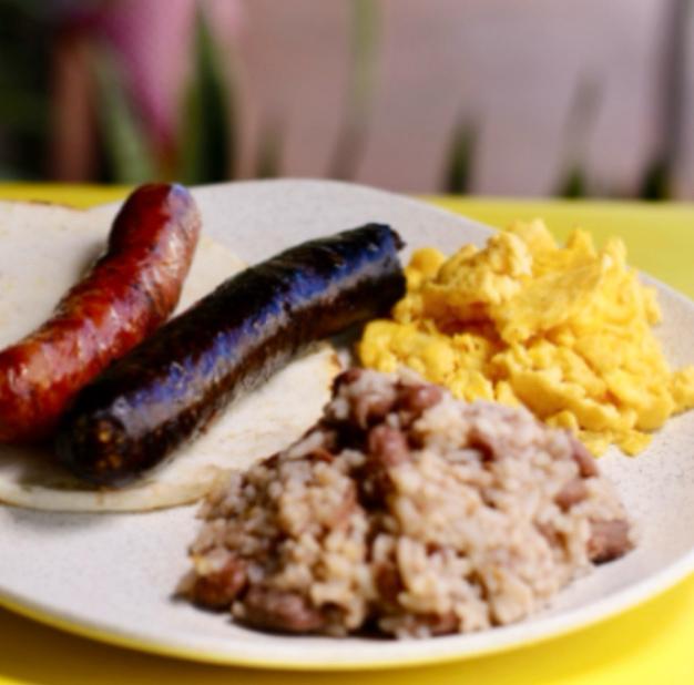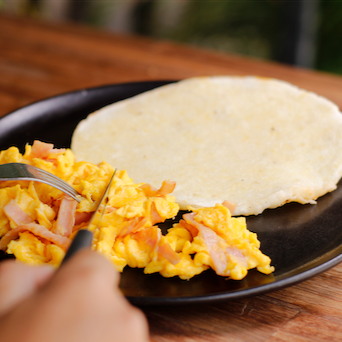 Arepa de maiz , calentado , huevos revueltos , chorizo y morcilla casera .