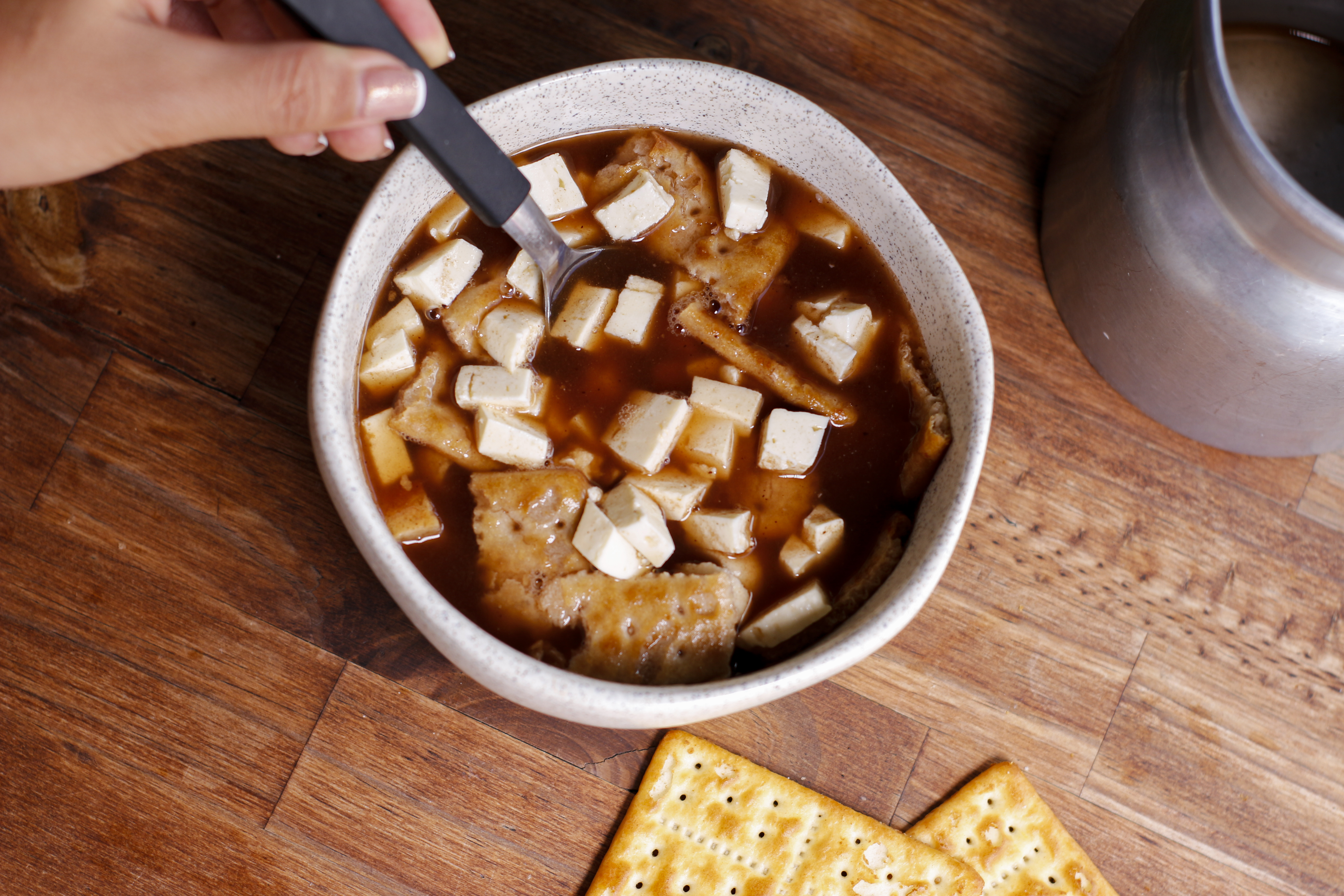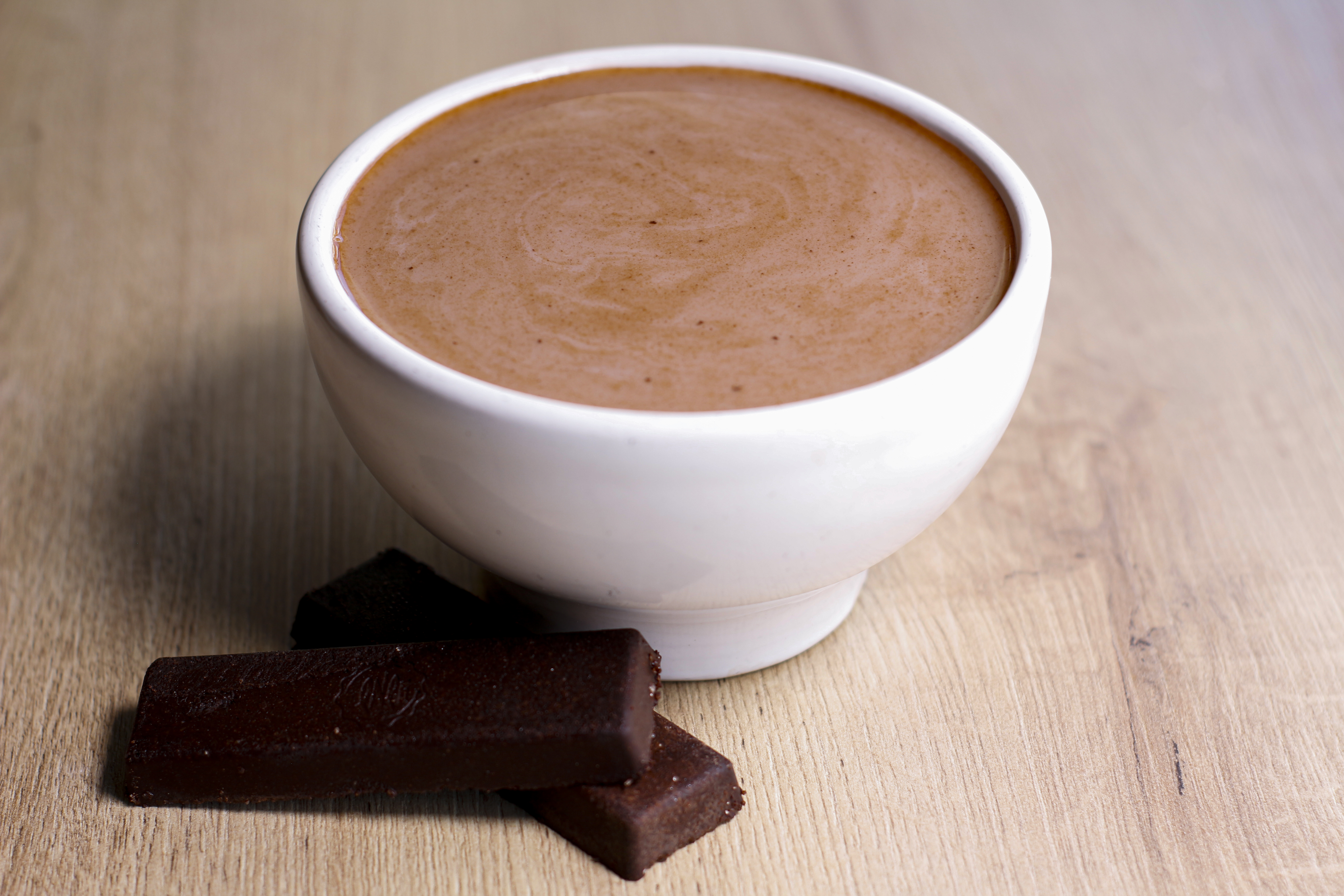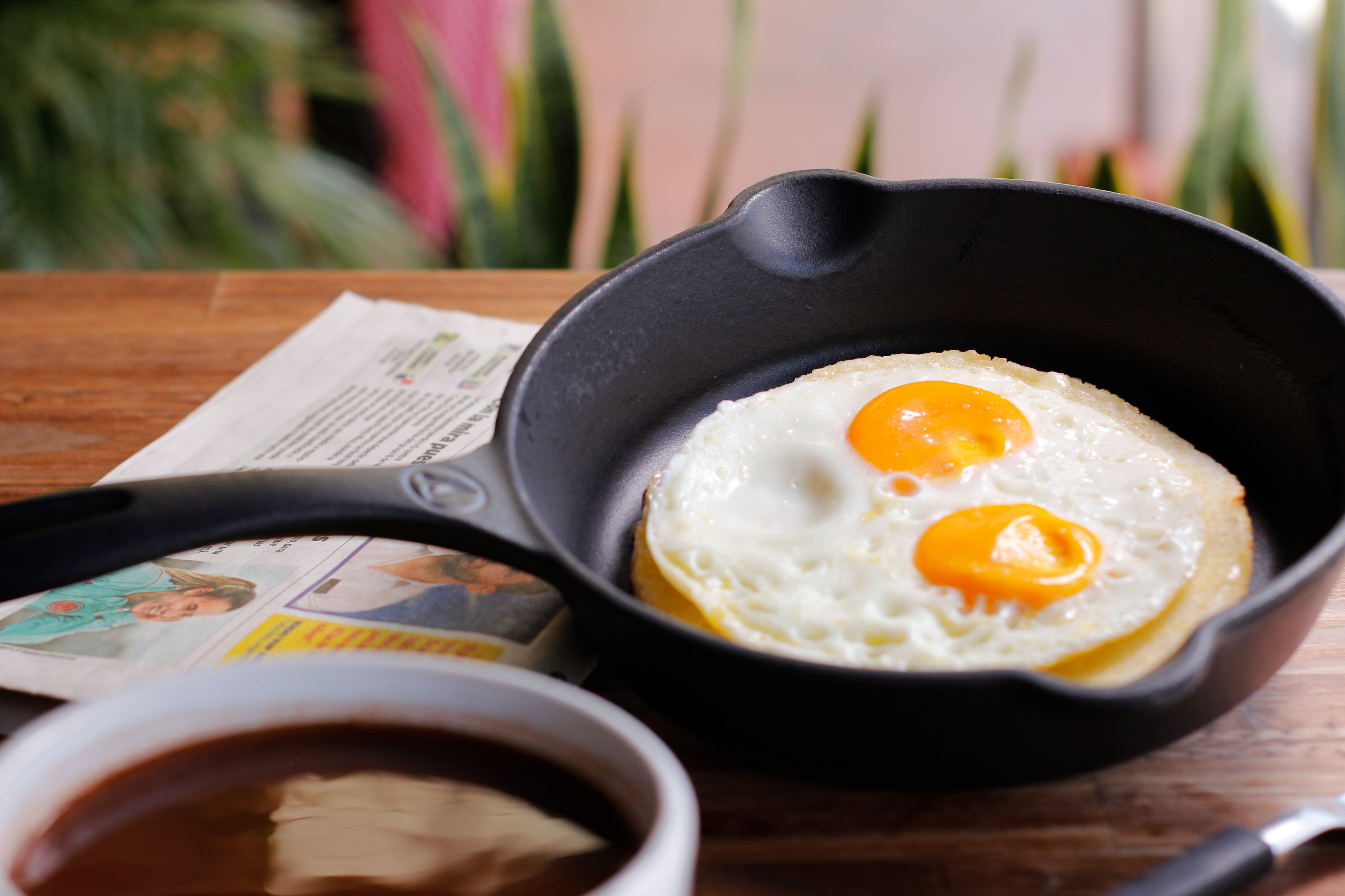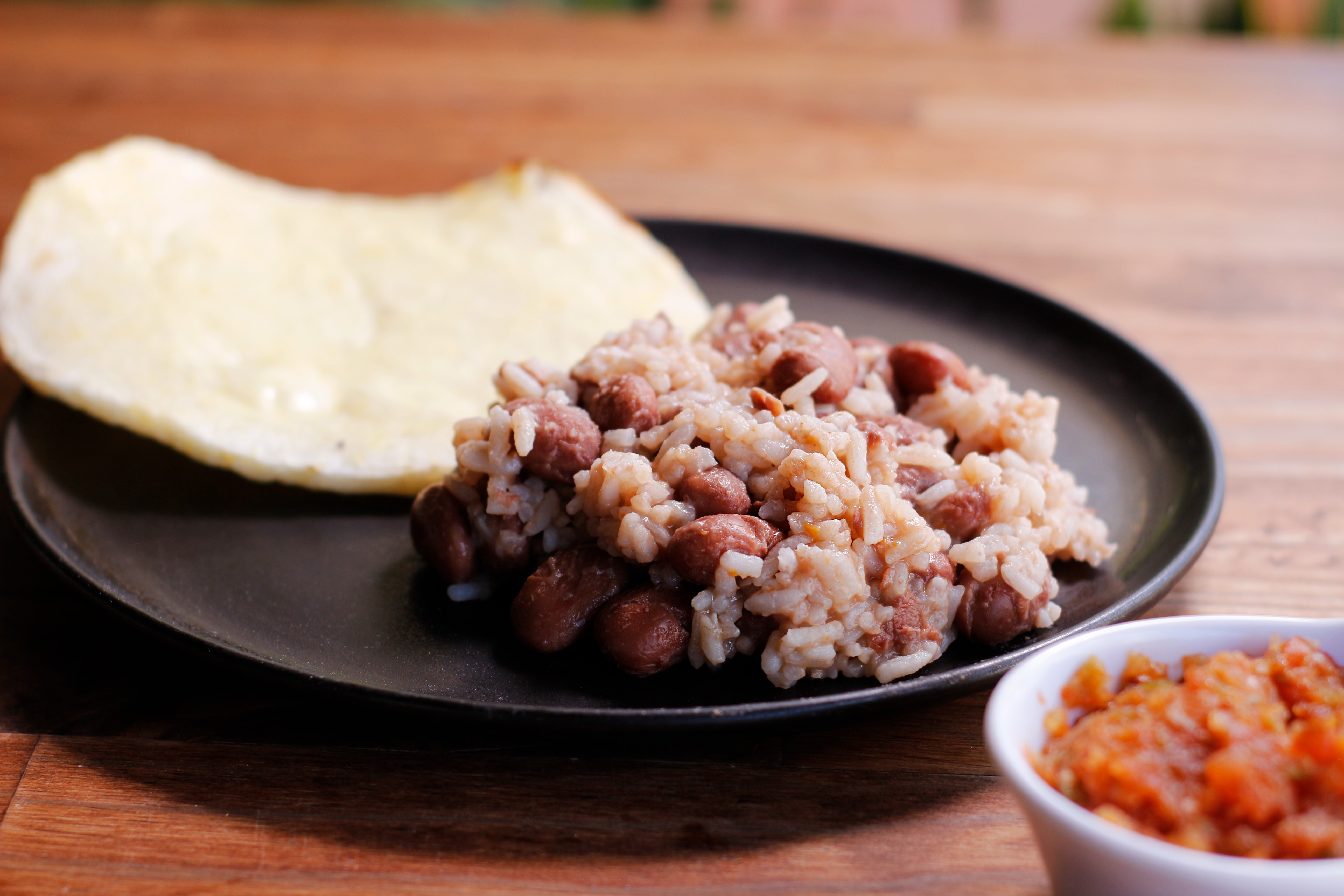 Arepa con quesito fresco, huevos mantequilla, calentado paisa, chicharrón y chocolate.