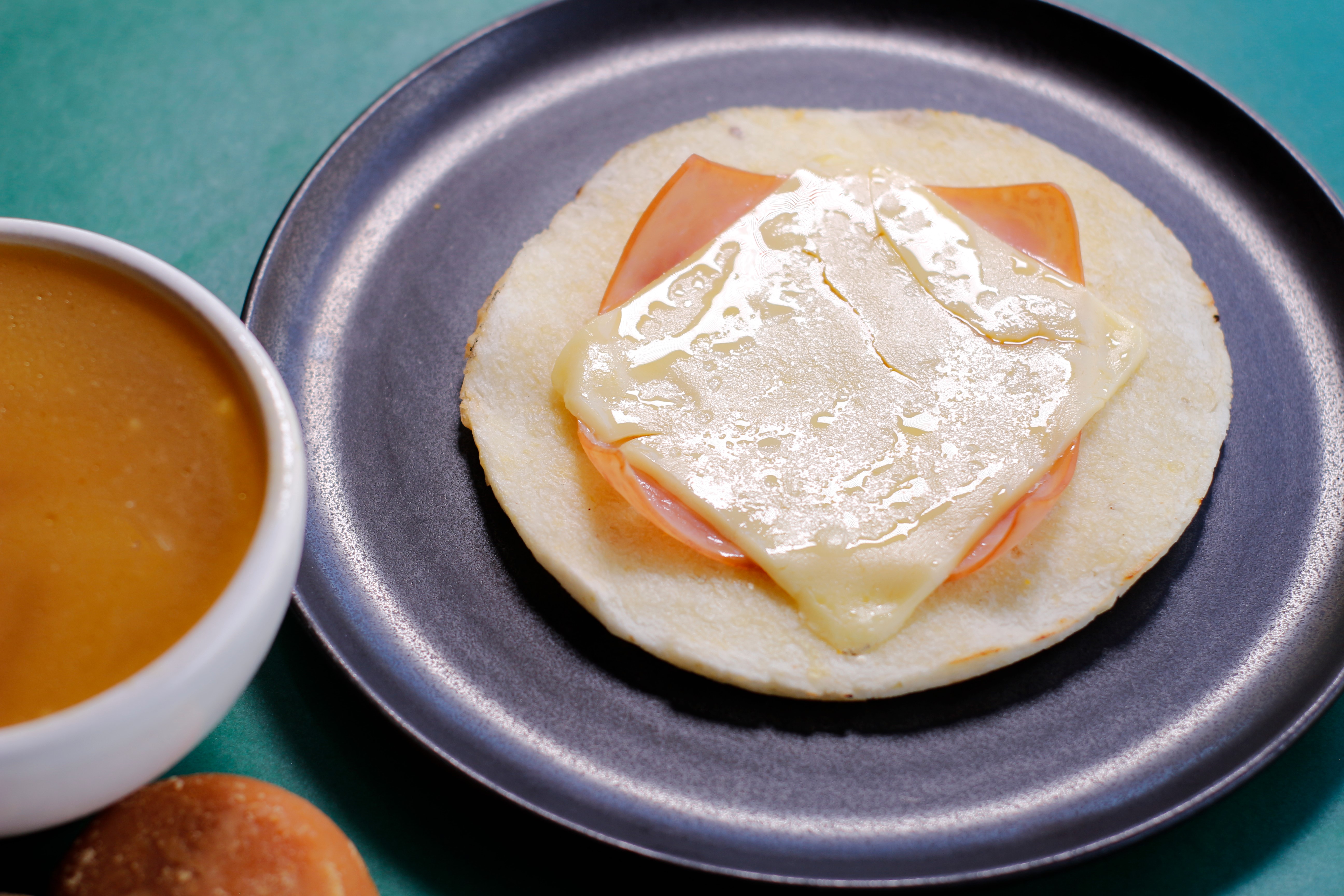 Arepa, jamón, queso mozzarella.