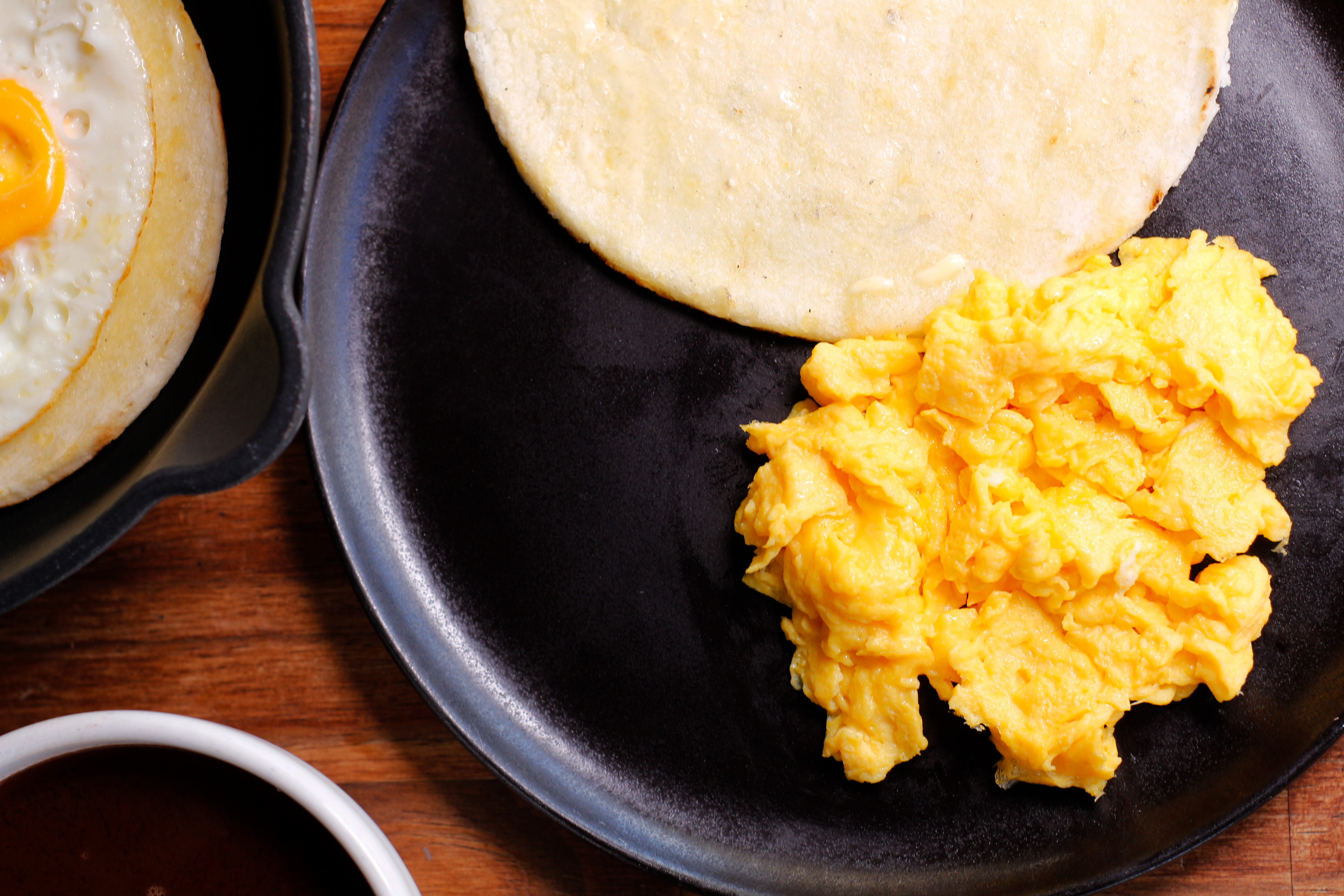 Arepa con huevos revueltos o huevo frito.