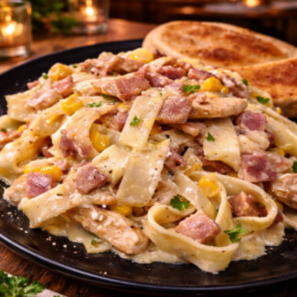 Exquisita pasta con salsa de tocineta, maicito y pollo, acompañada de pan al ajillo crocante, Cremosa, crocante y absolutamente adictiva.