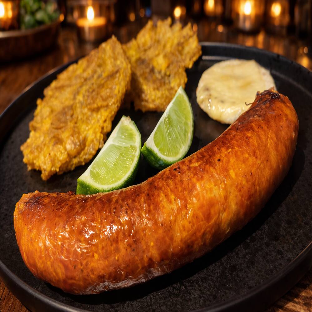 Delicioso chorizo artesanal de cerdo, con el autentico sabor que nos caracteriza, acompañado de patacones.