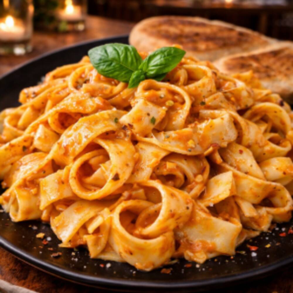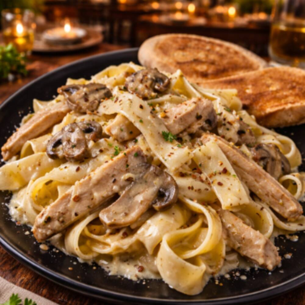 Deliciosa pasta con salsa de champiñones y pollo, acompañada de pan al ajillo crocante, un clásico que siempre provoca.