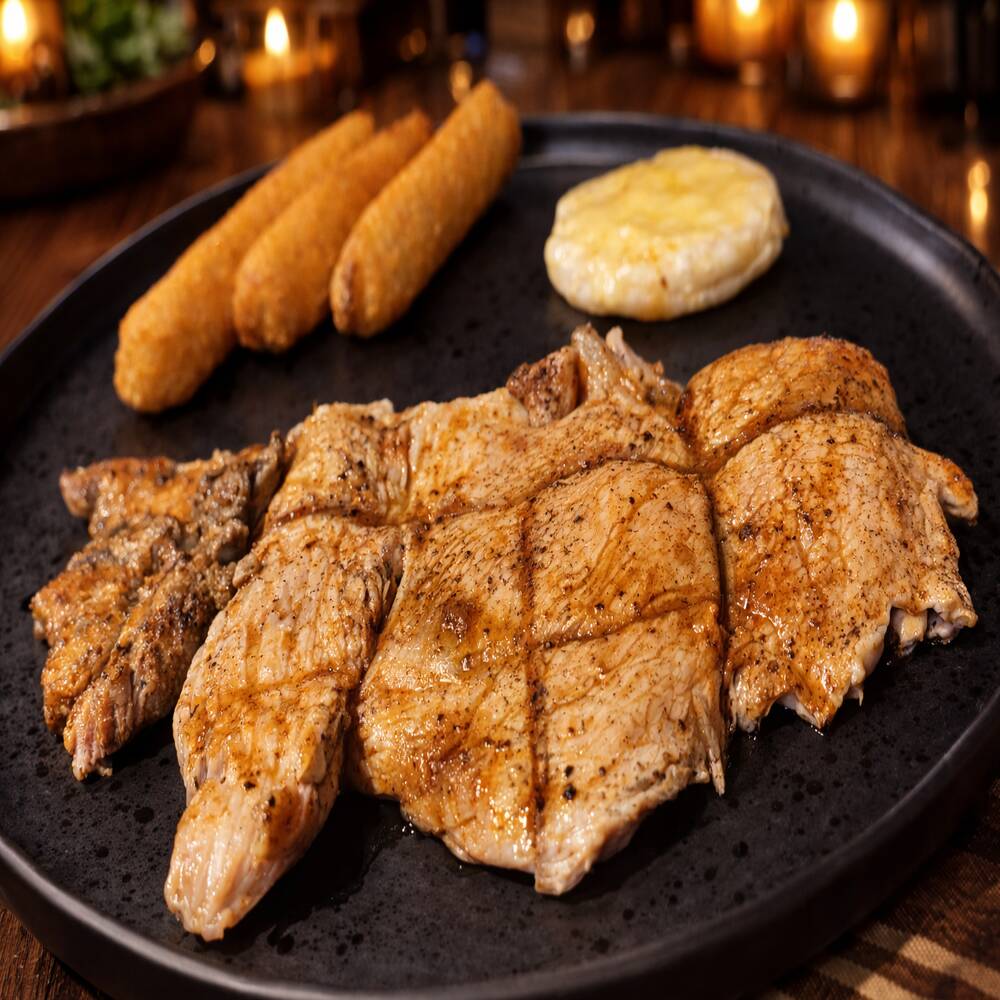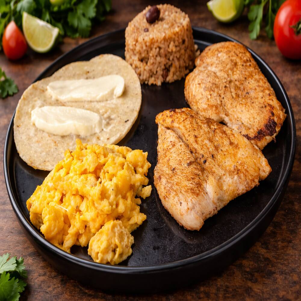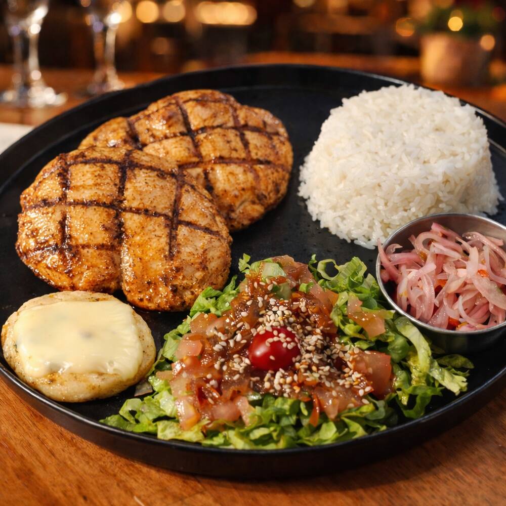 Pechuga de pollo al grill, dorada y jugosa, papas francesas crujientes, mini arepas con queso fundido, fresca ensalada de campo, cebolla acevichada.