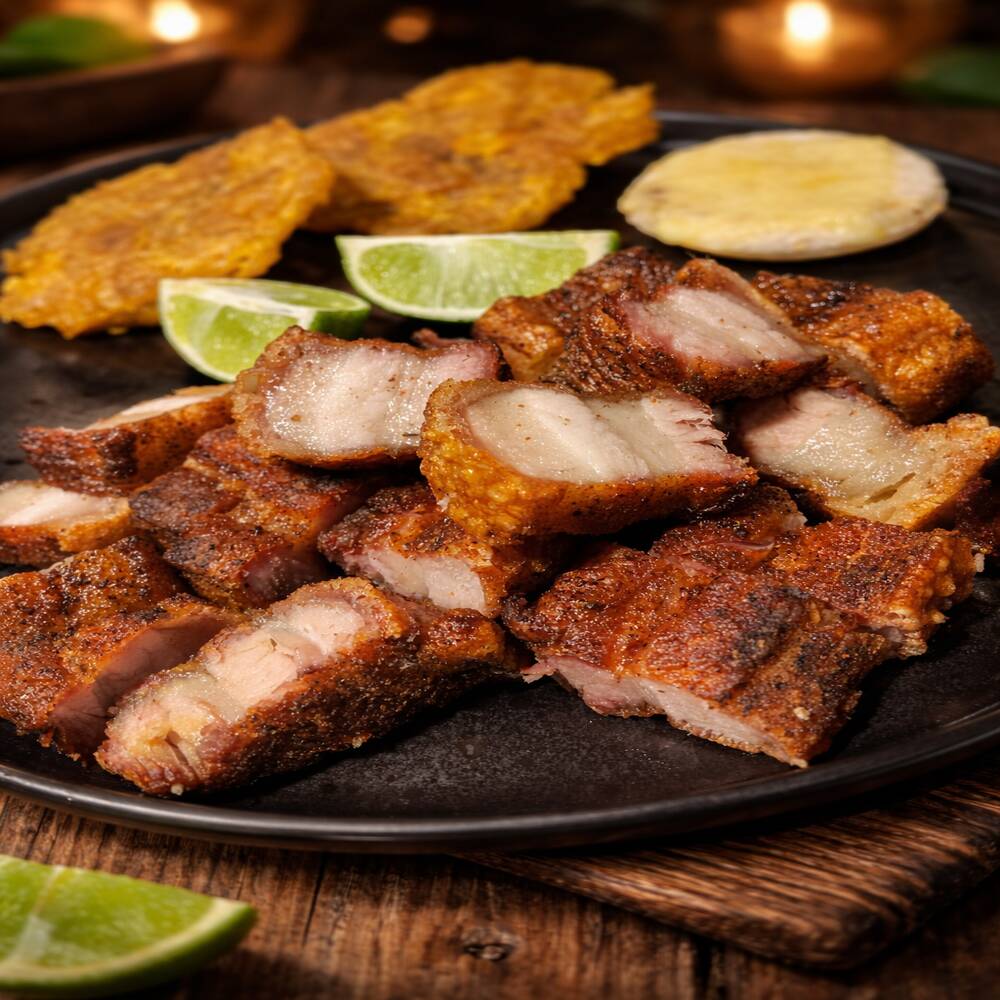 Crocantico chicharrón al barril, acompañado de patacones, cebolla encurtida y limón, ideal para calmar ese antojito.