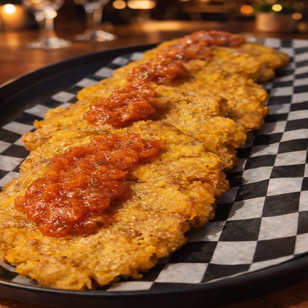 Patacones dorados y crujientes recién hechos con el toque perfecto de hogao casero.