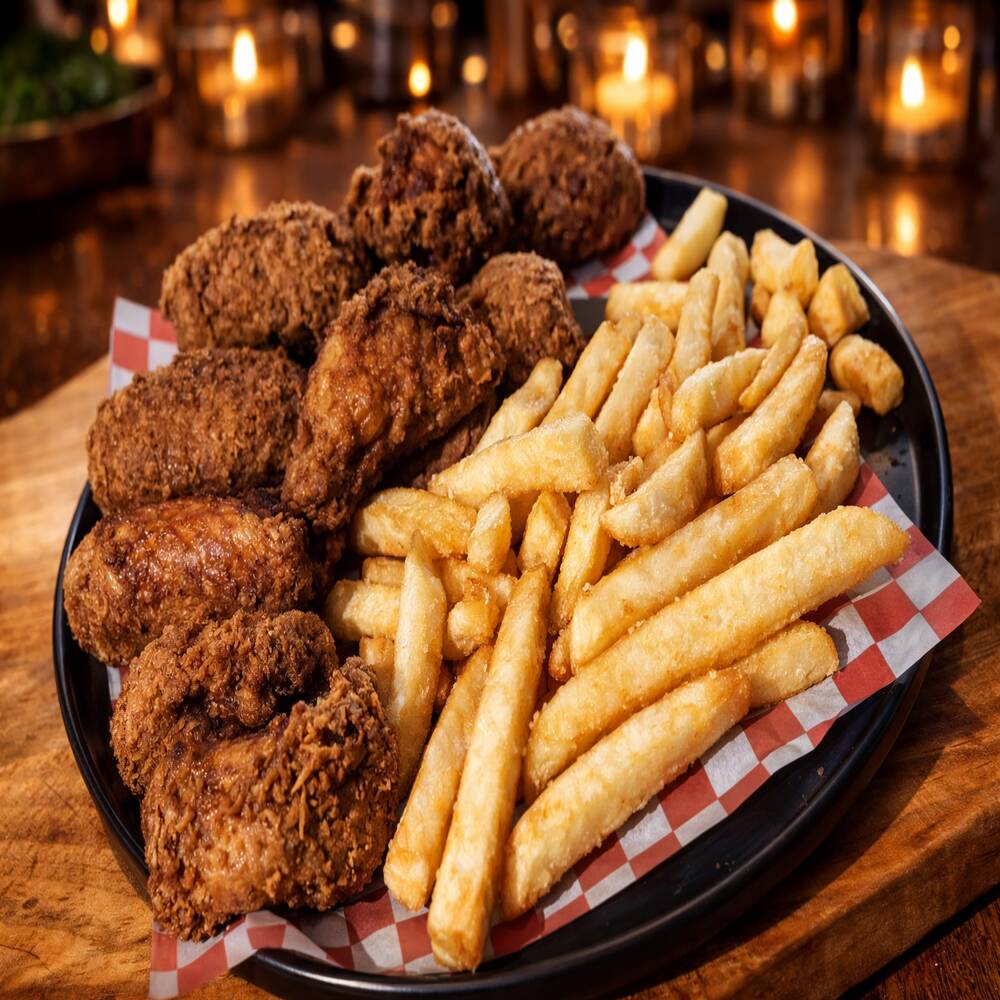 Alitas jumbo irresistibles, doradas al punto perfecto, con papas fritas crocantes y cubiertas en la salsa de tu elección