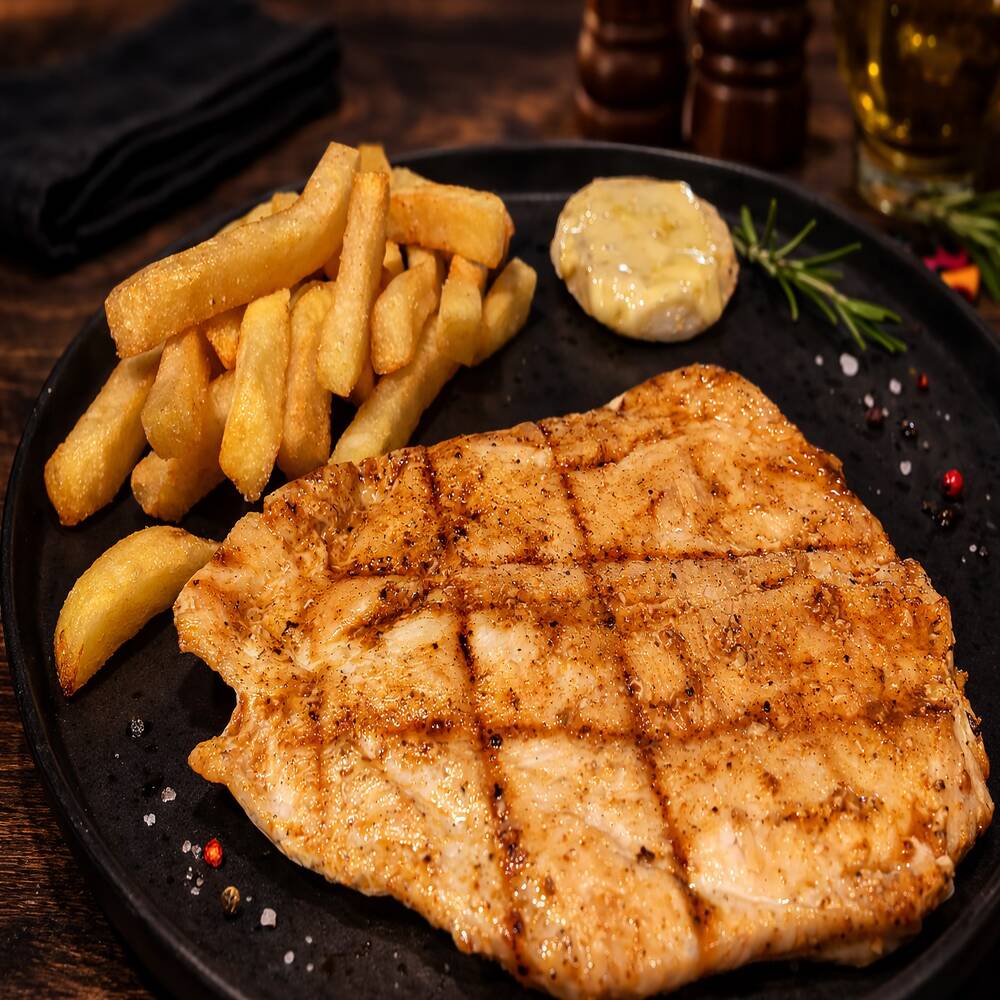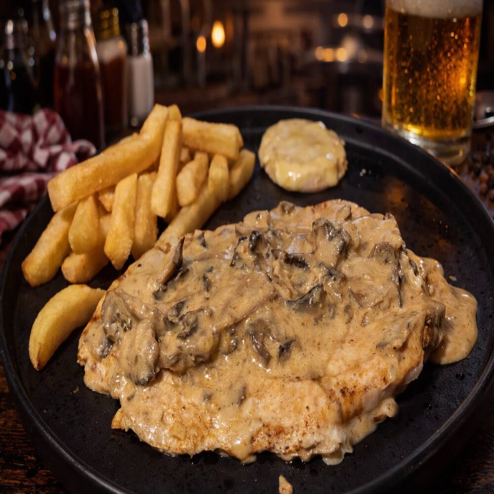 Pechuga de pollo al grill, en salsa funghi, servida con papas a la francesa, para disfrutar sin remordimientos.