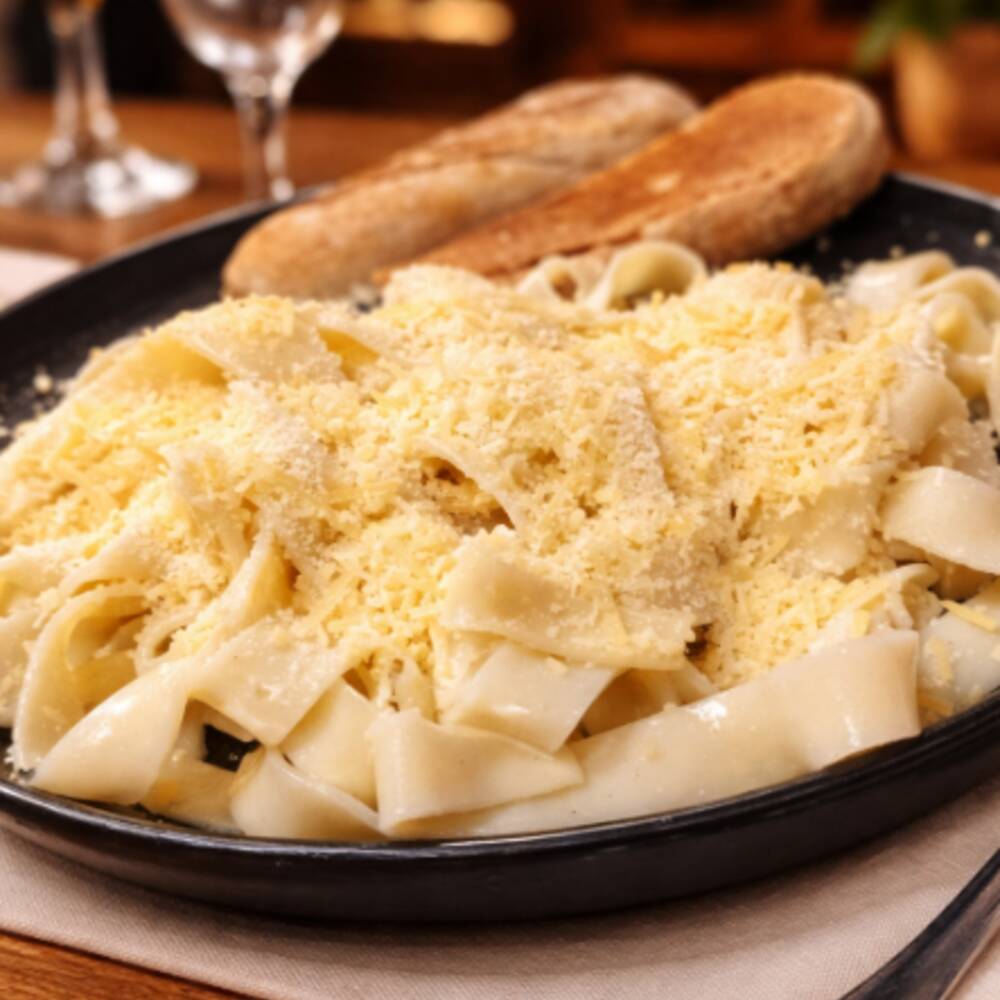 Deliciosa pasta con salsa de parmesano y pollo, acompañada de pan al ajillo crocante, clásica y deliciosa.
