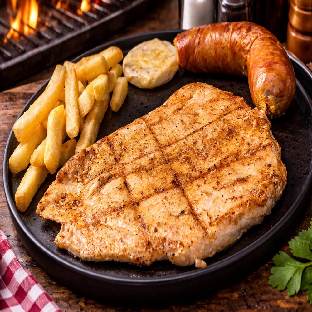 Pechuga de pollo al grill, bañada con nuestro autentico chimichurri, servida con papas a la francesa y chorizo artesanal.