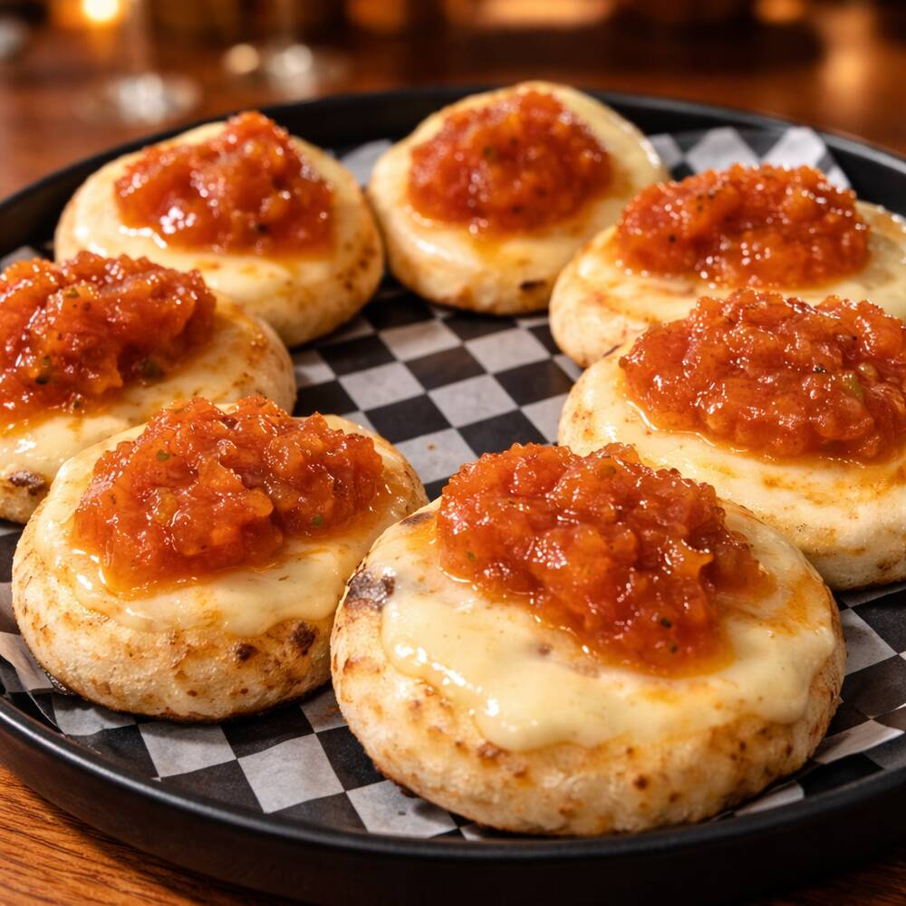 Arepitas doradas con mantequilla casera, con queso mozzarella fundido y nuestro hogao de la casa.