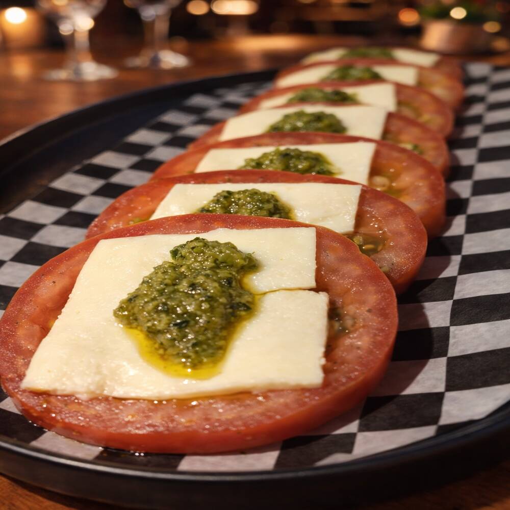 Tomate fresco en finos cortes, acompañado de mozzarella en láminas y realzado con pesto casero, sal marina y pimienta recién molida.