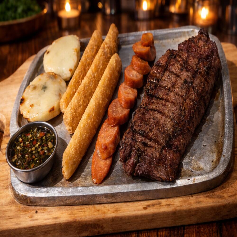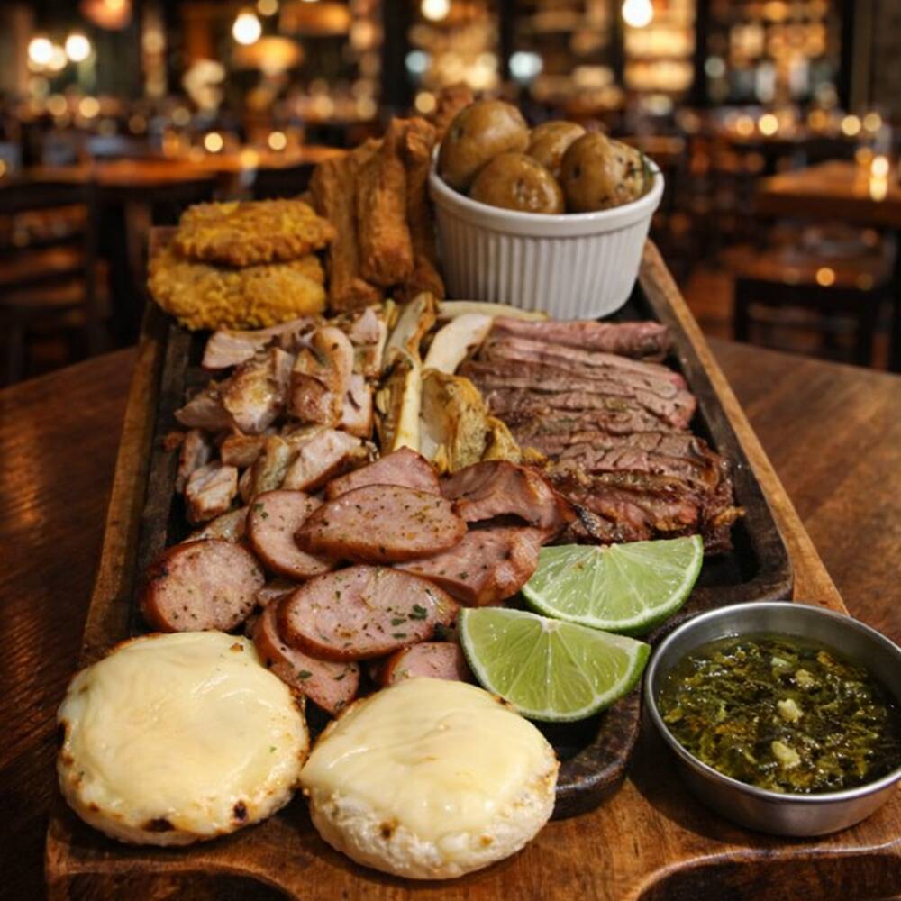 Exquisita combinación de carnes al grill, punta de anca, cerdo, pollo y chorizo, acompañada de arepitas con queso fundido, patacones, yuca frita, papa criolla infusionadas con romero, chimichurri casero y limón