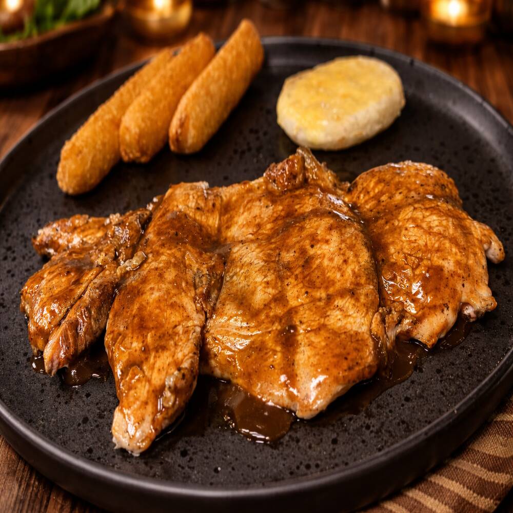 Pierna de cerdo dorada, acompañada de yuca frita crocante, fuego y sabor en versión ligera.