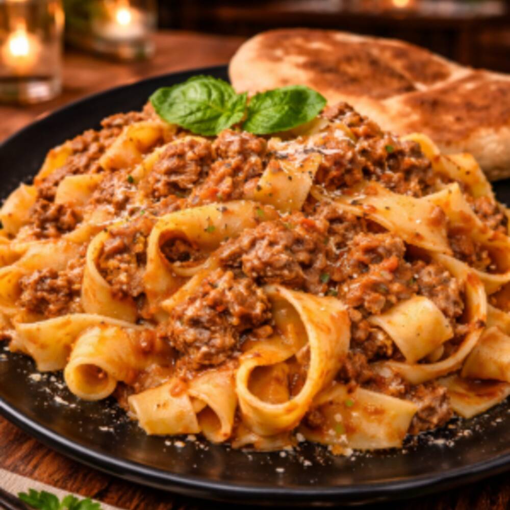 Exquisita pasta con carne molida, zanahoria apio, acompañada de pan al ajillo crocante, pura tentación