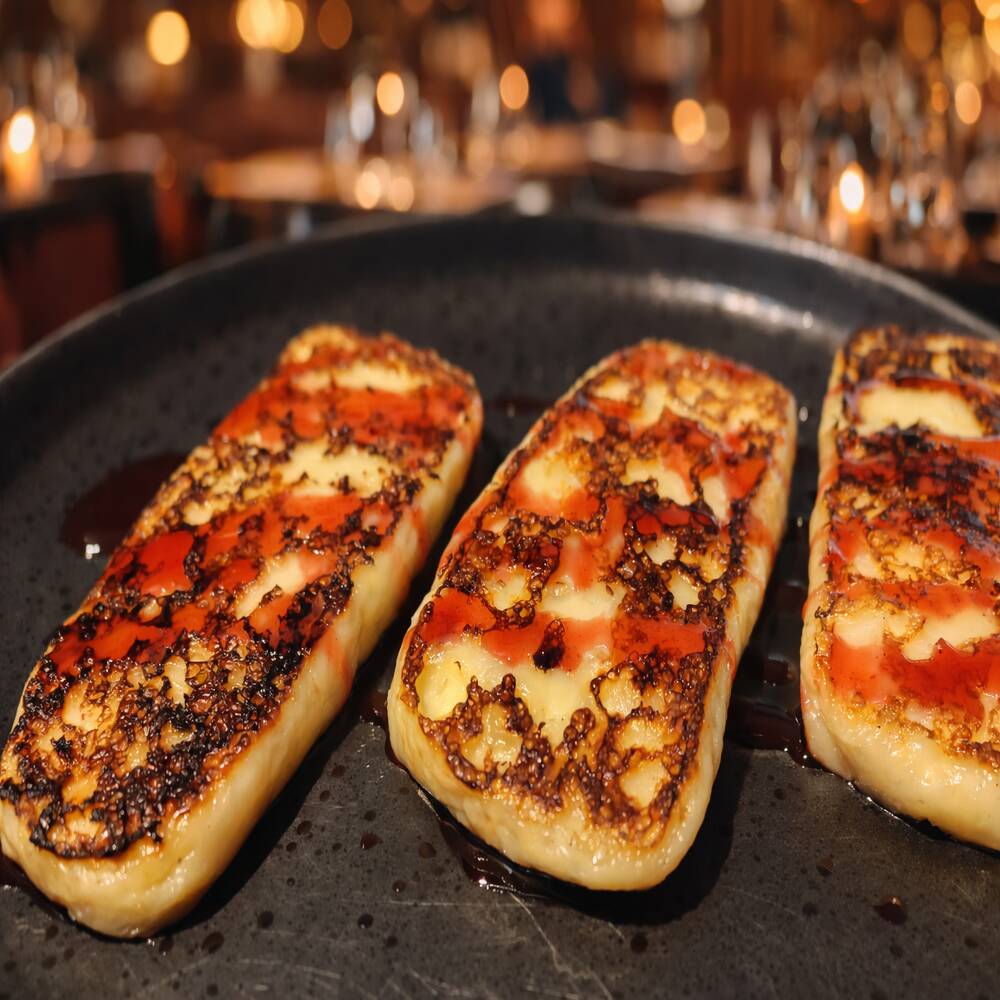 Queso asado en su punto perfecto, acompañado de una delicada reducción de frutos rojos que despierta todos los sentidos.