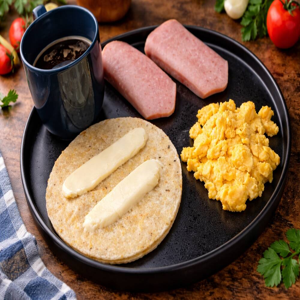Delicioso huevos revueltos con aliño o sin aliño, jamón, arepa tela con mantequilla casera y quesito y bebida caliente.