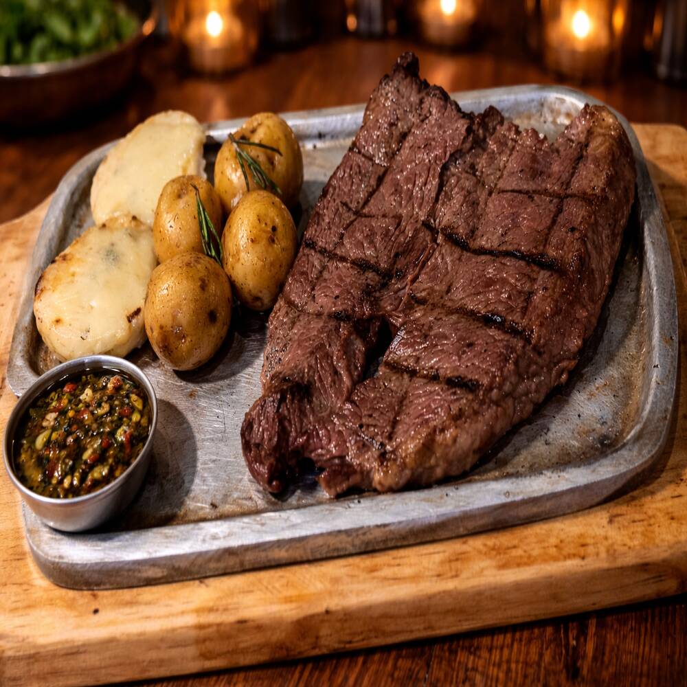 Corte grueso de res al grill, jugoso y con ese ahumado irresistible, acompañado de chorizo, yuca frita crocante, arepas con queso derretido, ensalada, cebolla acevichada y chimichurri.
