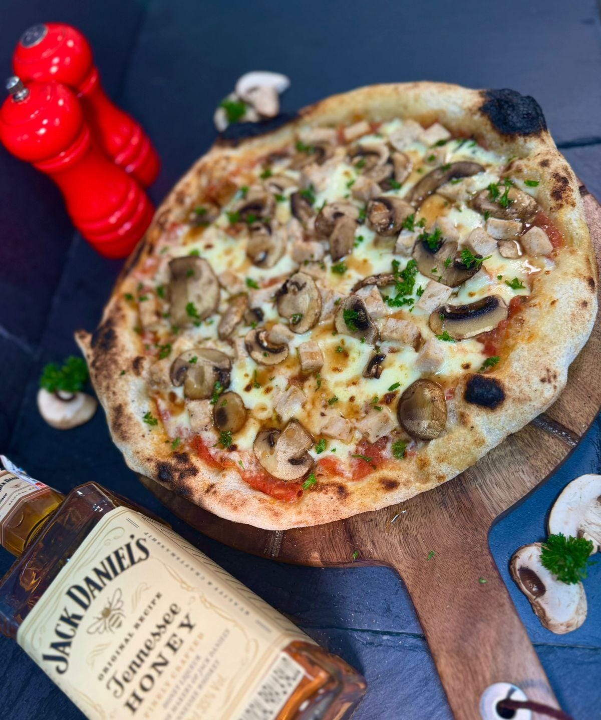 6 pociones - 35 cm Masa artesanal, Base Pomodoro, Pollo en trozo horneado, Champiñones, Chips de tocineta, Miel de Jack Daniels y Queso Mozzarella