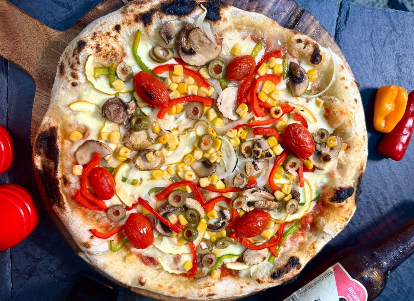 6 pociones - 35 cm Masa artesanal, Base Pomodoro, Cebolla, pimentones, aceitunas, maicito dulce, tomate cherry y Queso Mozzarella