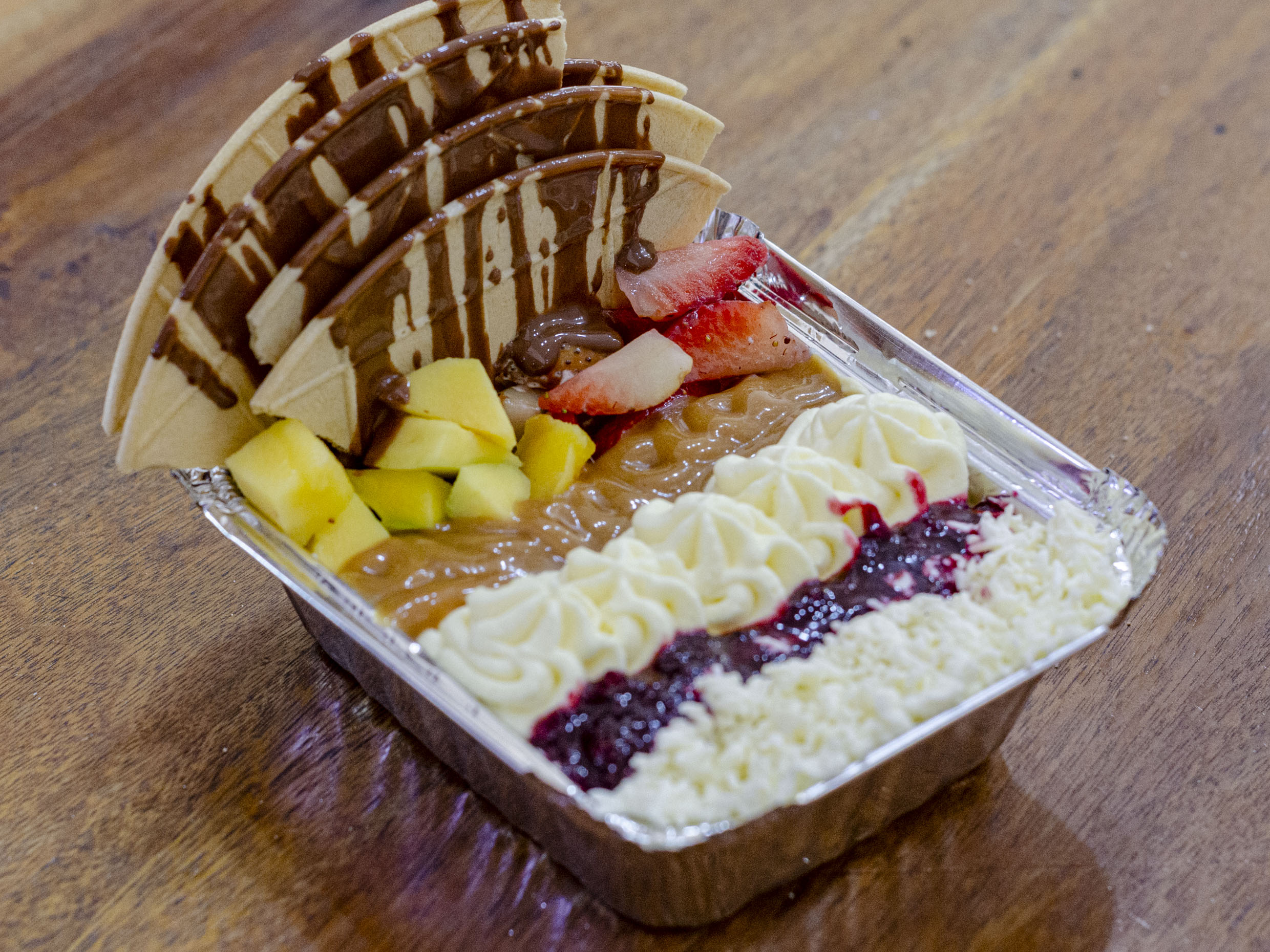 Combinacion de Frutas, Oblea, queso, arequipe, salsa de mora y nuestra irresistible crema artesanal.