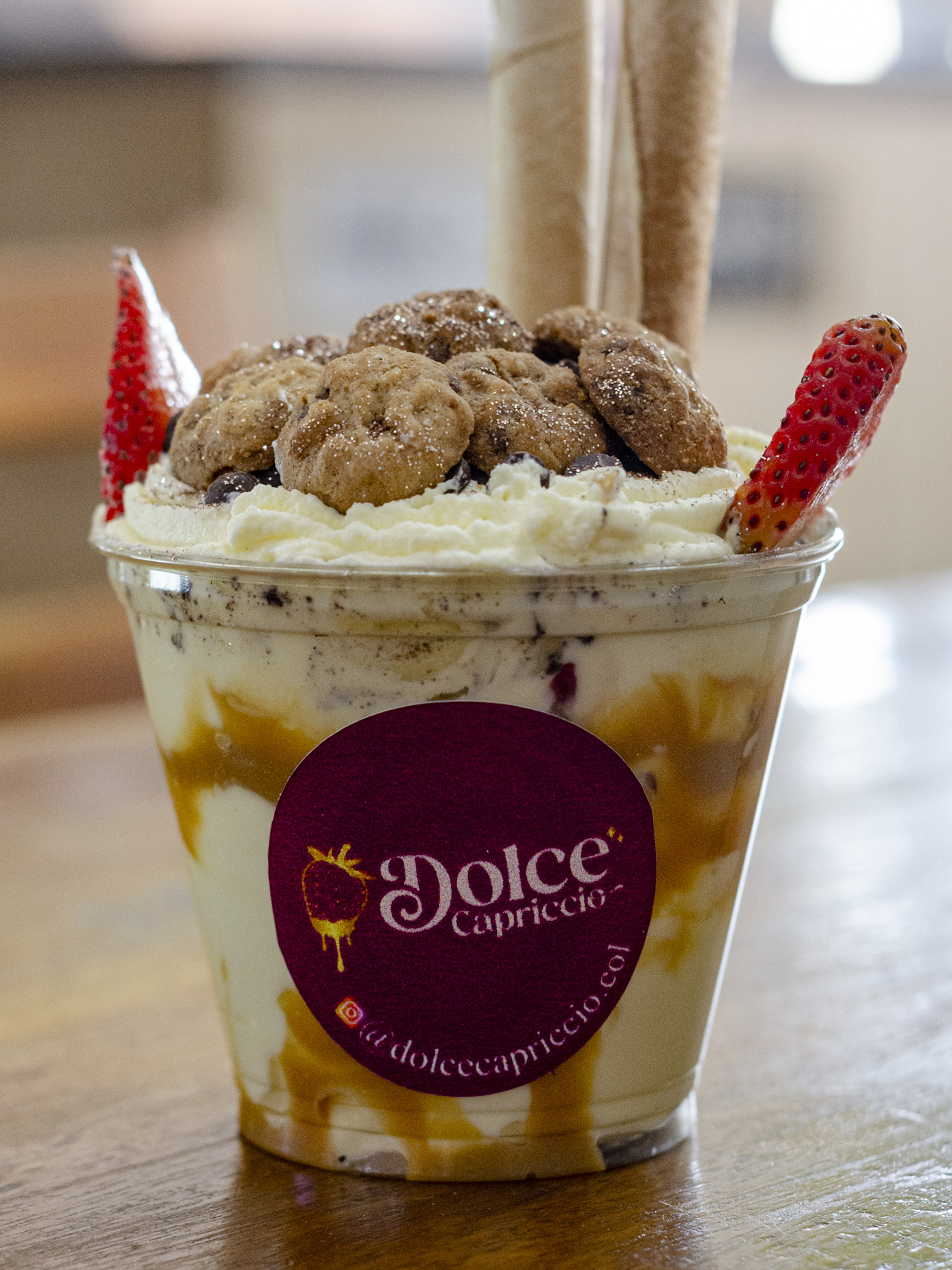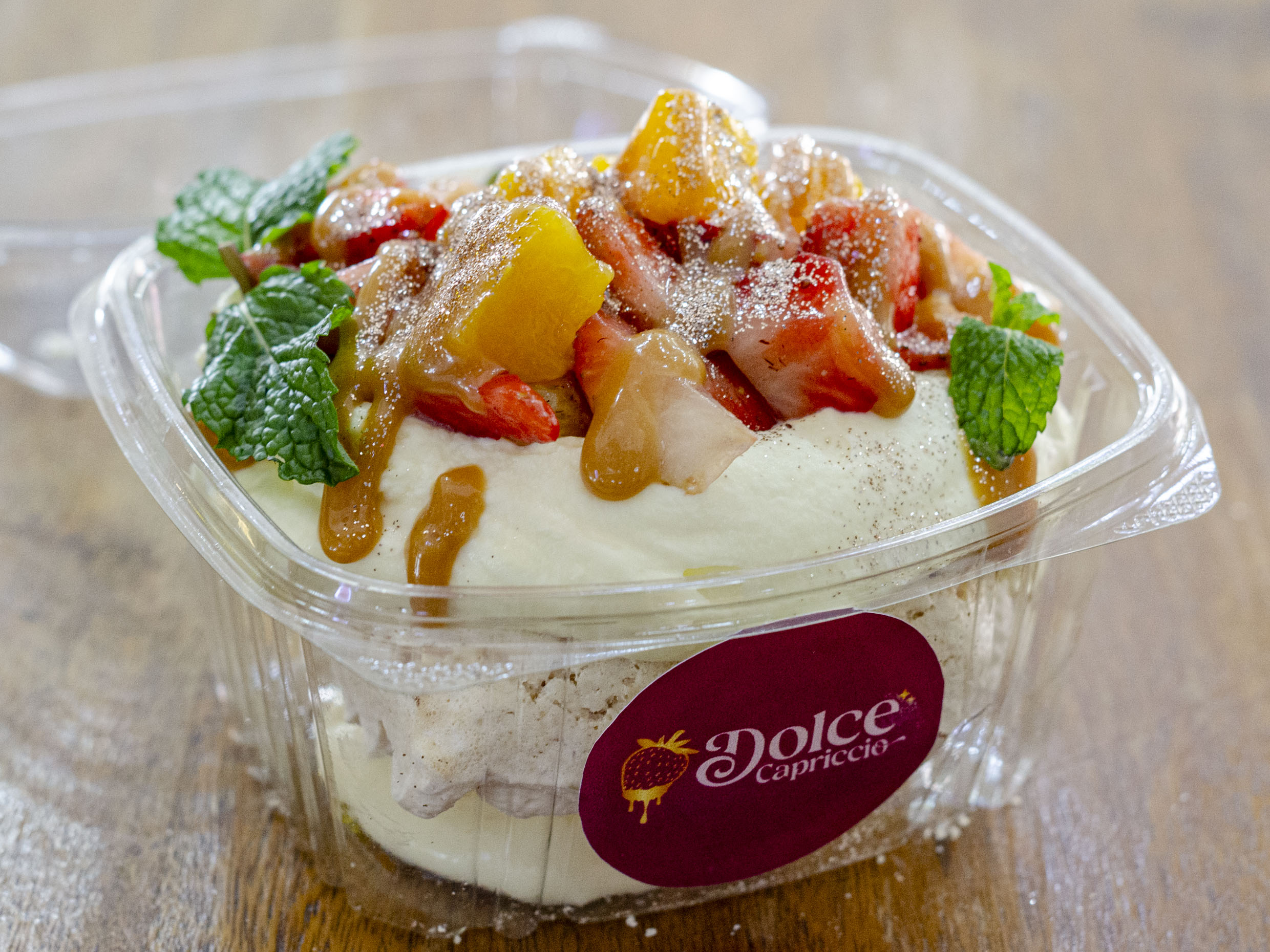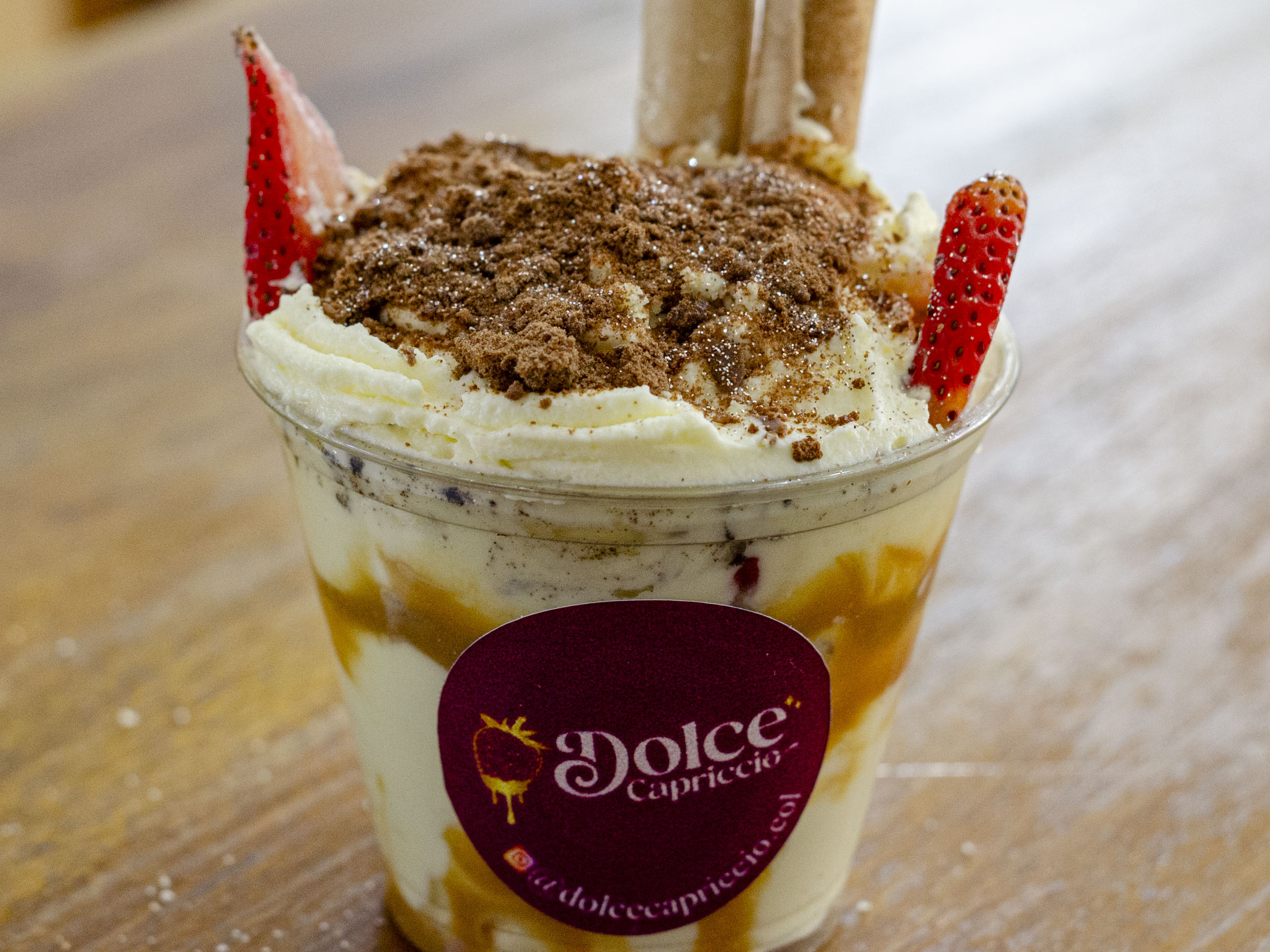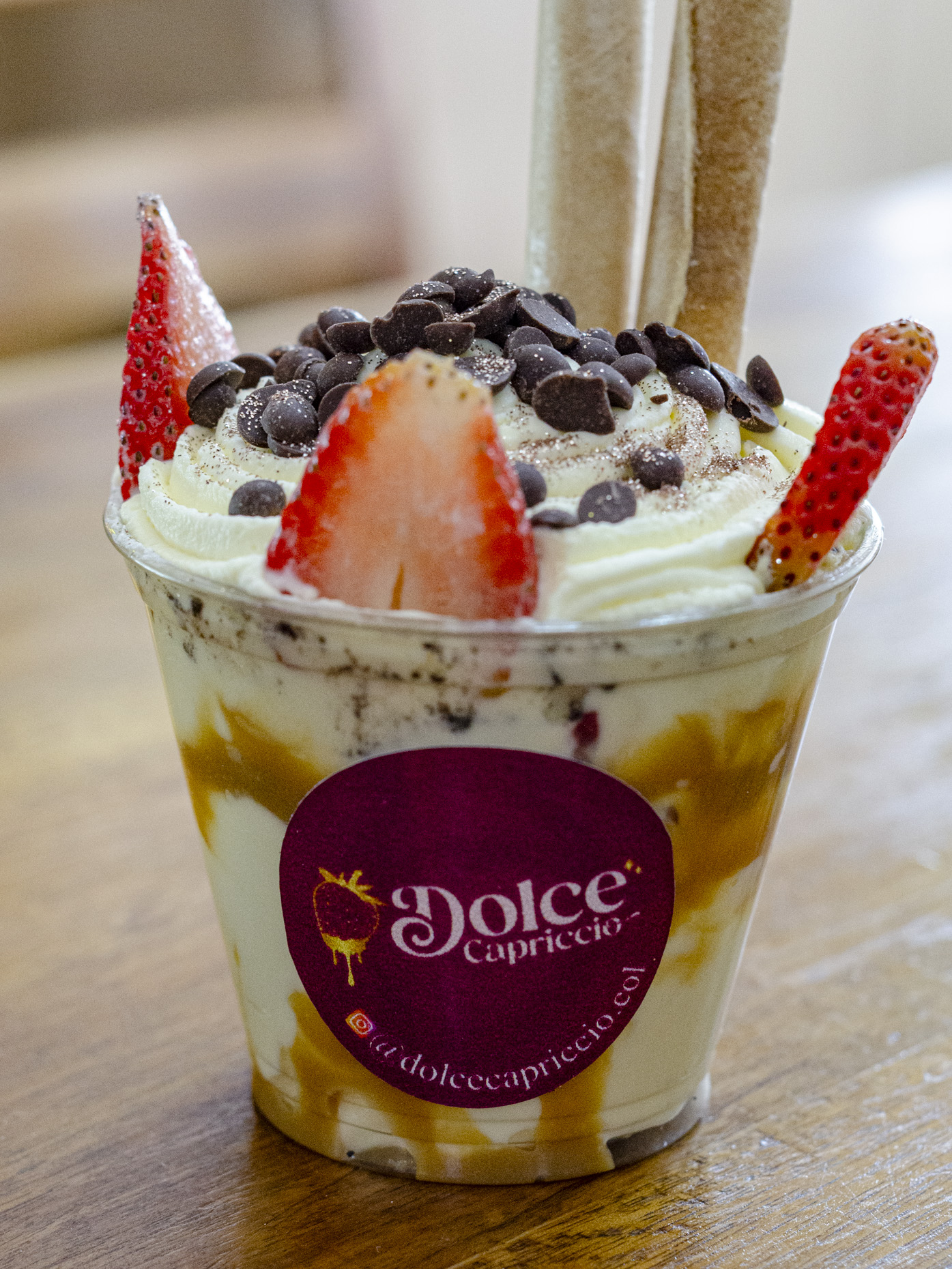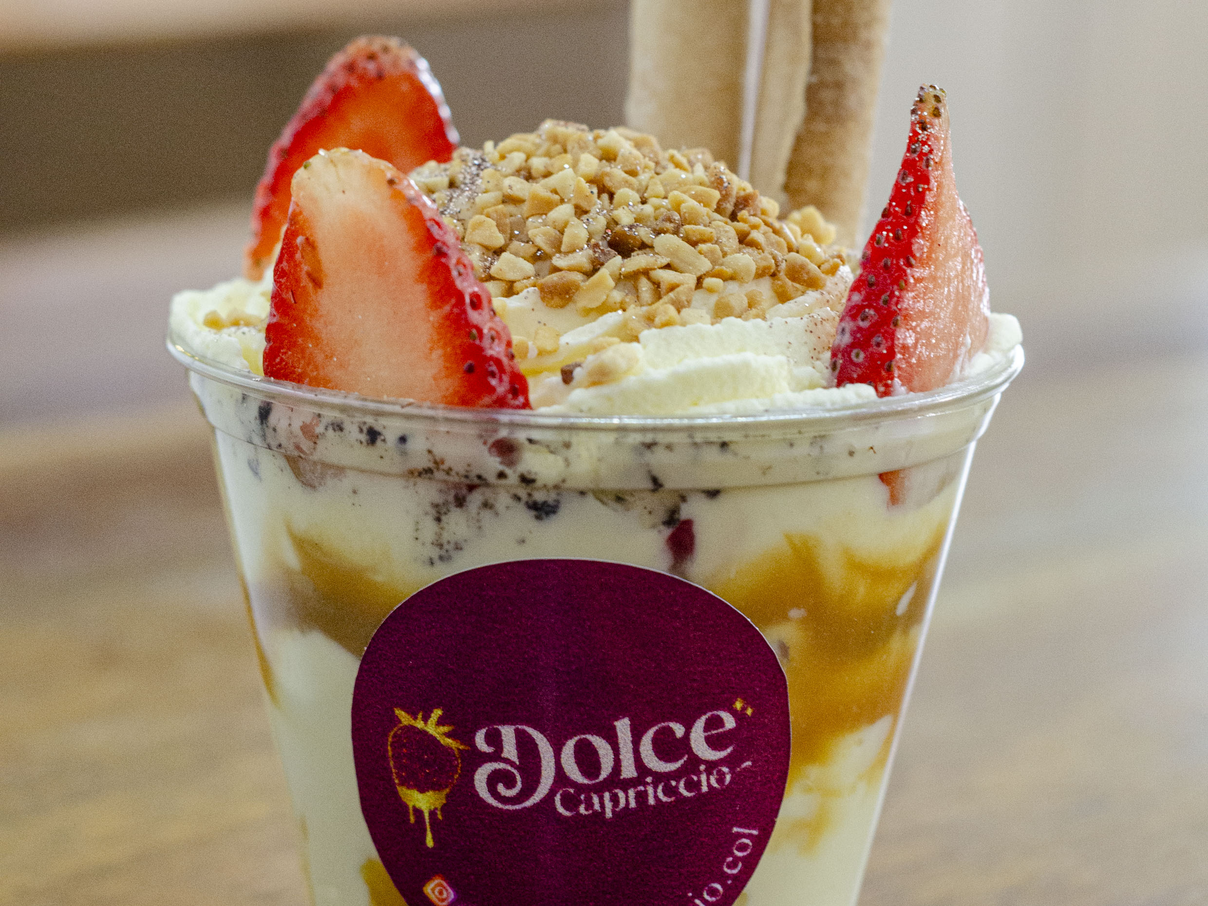 Delicioso Merengon acompañado con crema y 2 frutas a eleccion + 1 fresas con crema 12 Onz con leche condensada y 1 topping a eleccion.