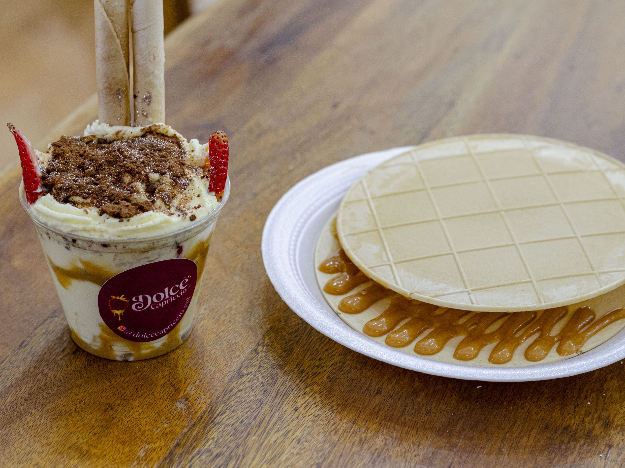 Obleas rellenas de arequipe, crema de la casa y fruta.