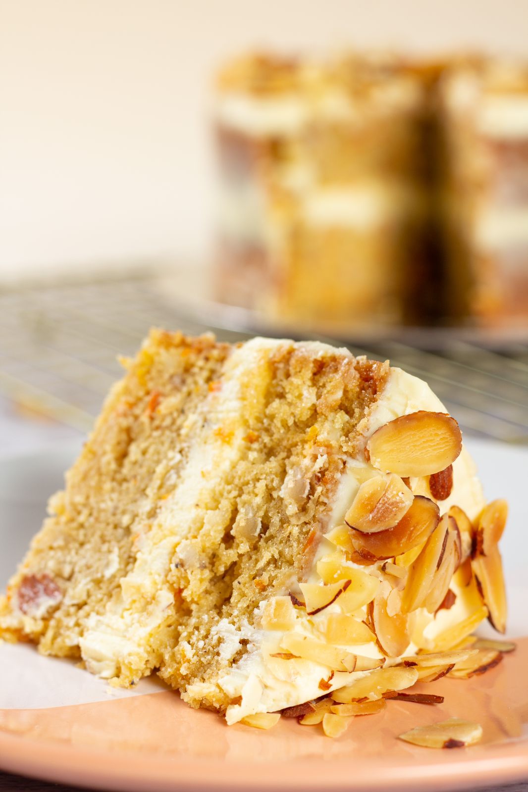 Deliciosa torta rellena de nueces con crema pastelera y finalizada de almendras fileteadas