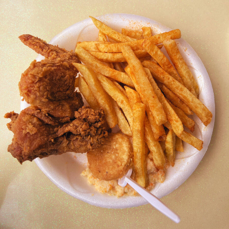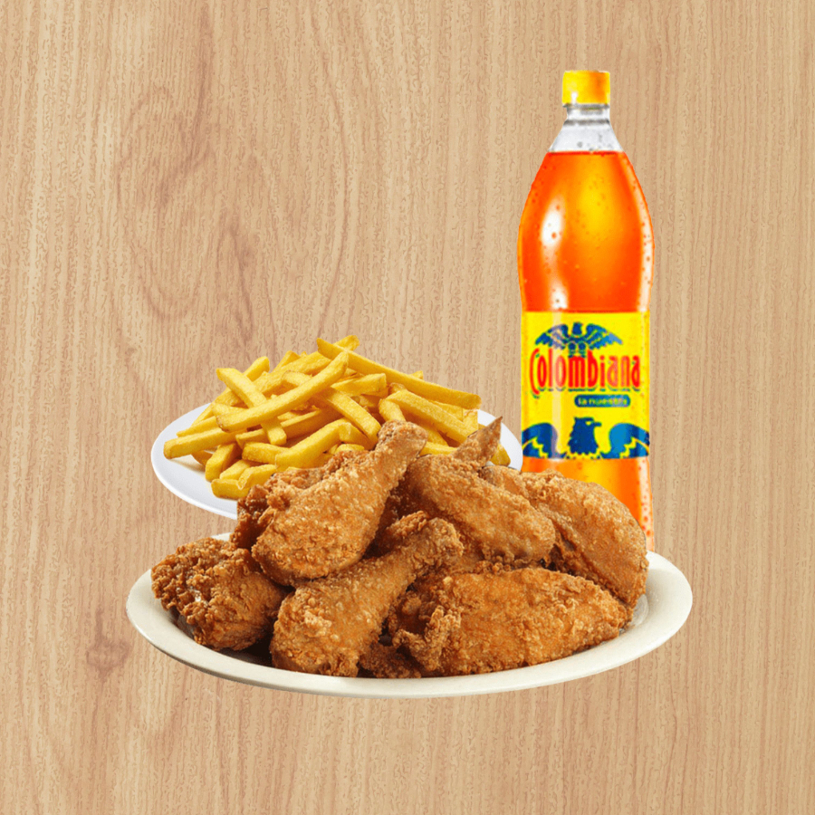 Acompañado de 8 presas, 8 papas cocidas, 8 arepas, una porción de papas a la francesa y gaseosa 1.5 L Postobon.