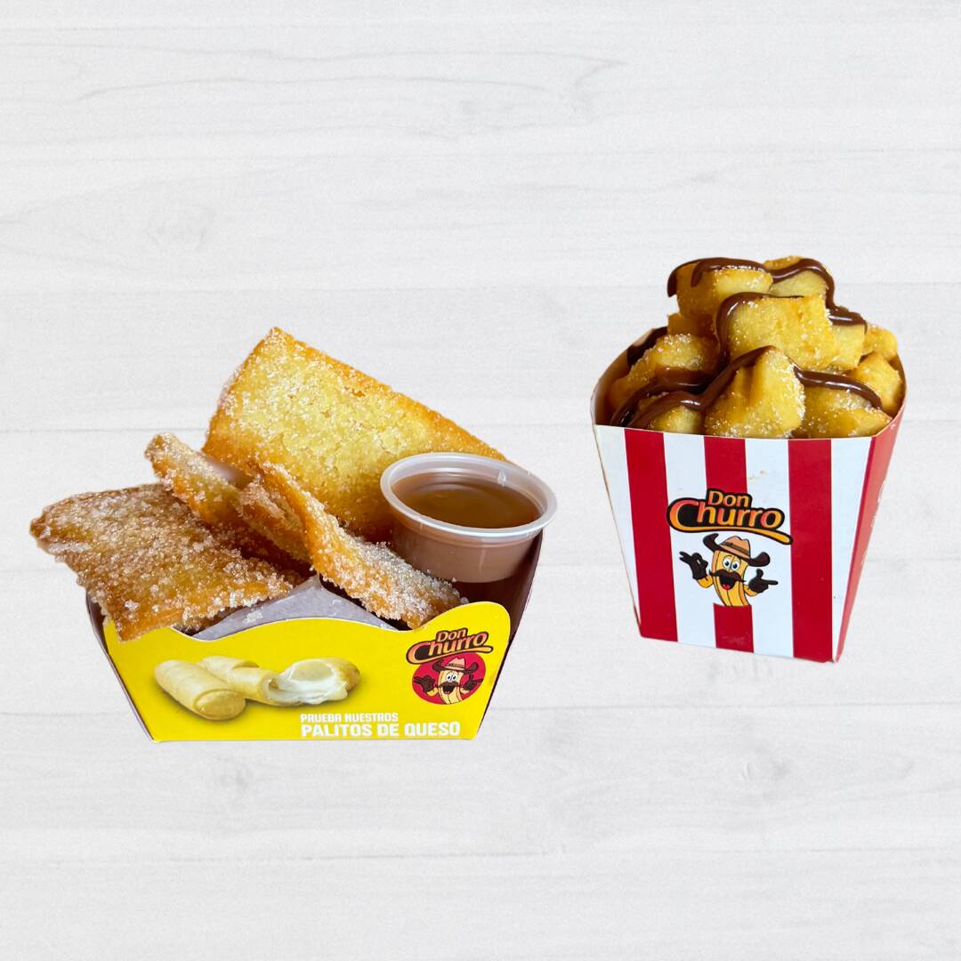 puedes mezclarlos entre Rellenitos, Bocaditos, Corazones, Don Churro y Españoles) y 2 porciones de churros salados (puedes mezclarlos entre queso cheddar, queso mozzarella, salchicha y cábano)