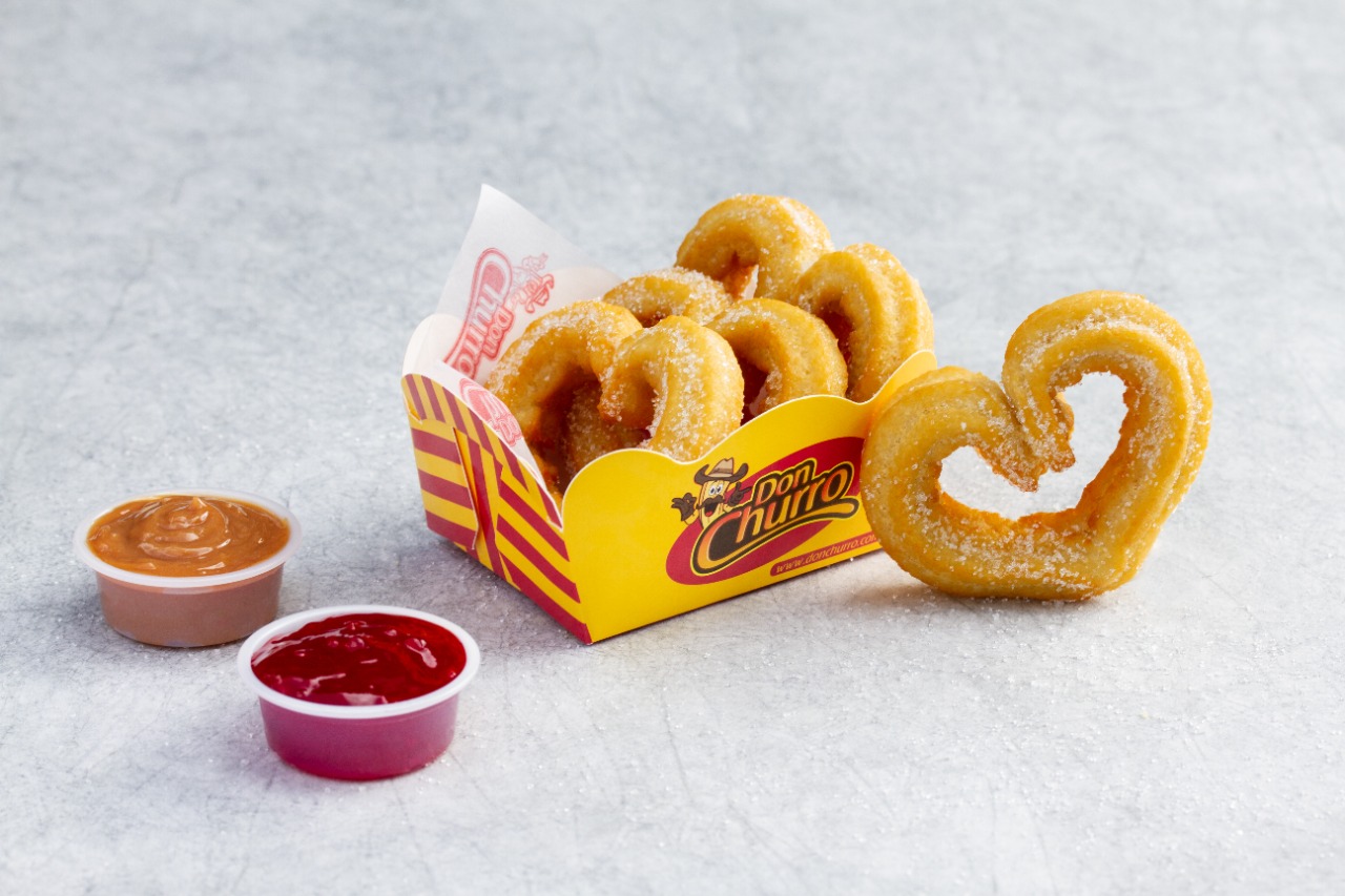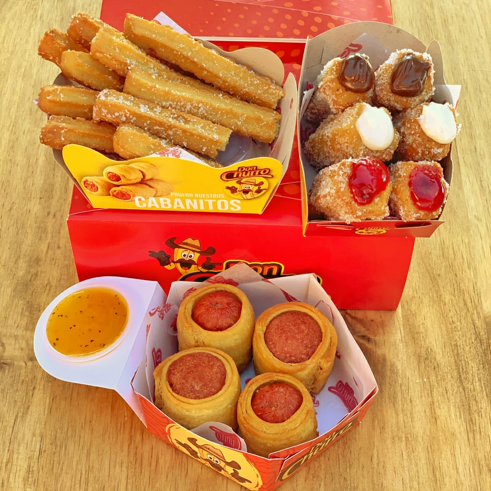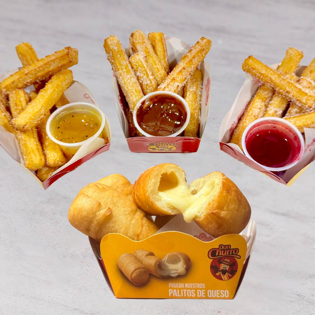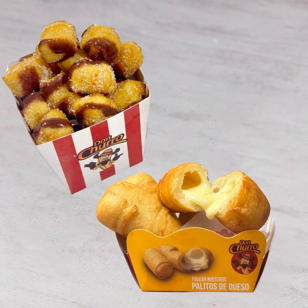 puedes mezclarlos entre Rellenitos, Bocaditos, Corazones, Don Churro y Españoles) y 2 porciones de churros salados (puedes mezclarlos entre queso cheddar, queso mozzarella, salchicha y cábano)