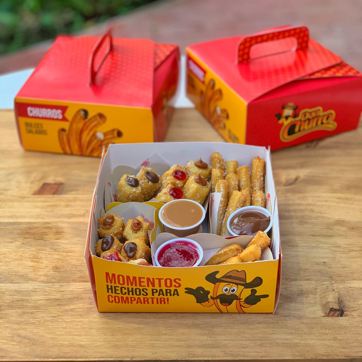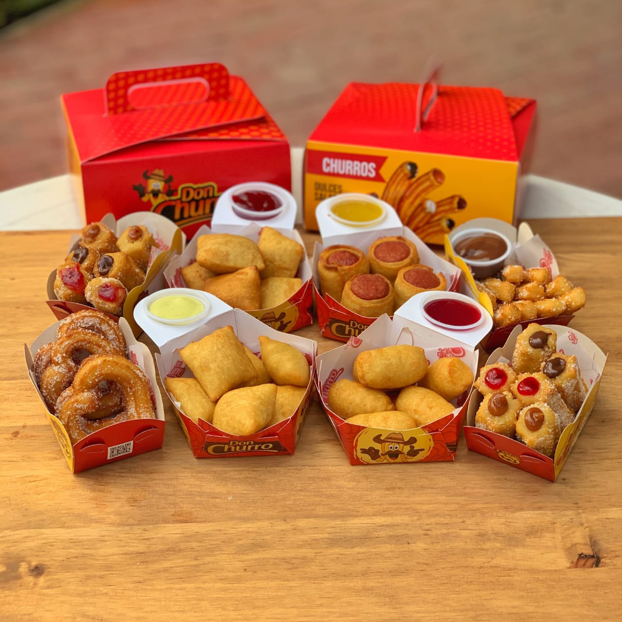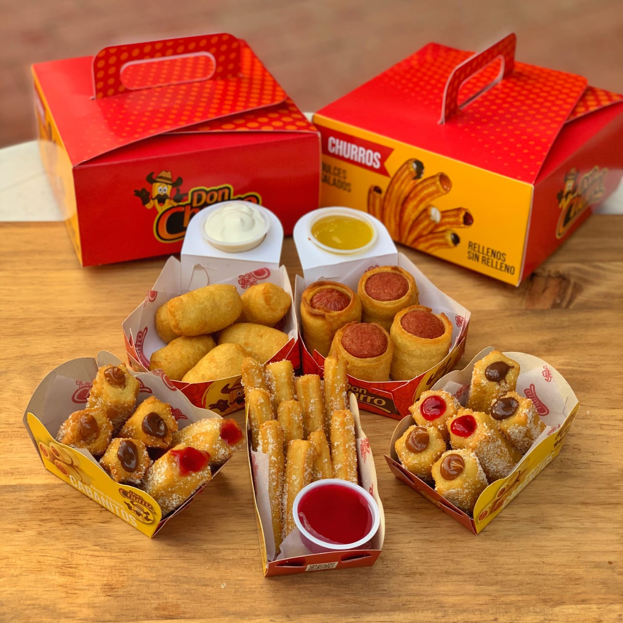 puedes mezclarlos entre Rellenitos, Bocaditos, Corazones, Don Churro y Españoles) y 2 porciones de churros salados (puedes mezclarlos entre queso cheddar, queso mozzarella, salchicha y cábano)