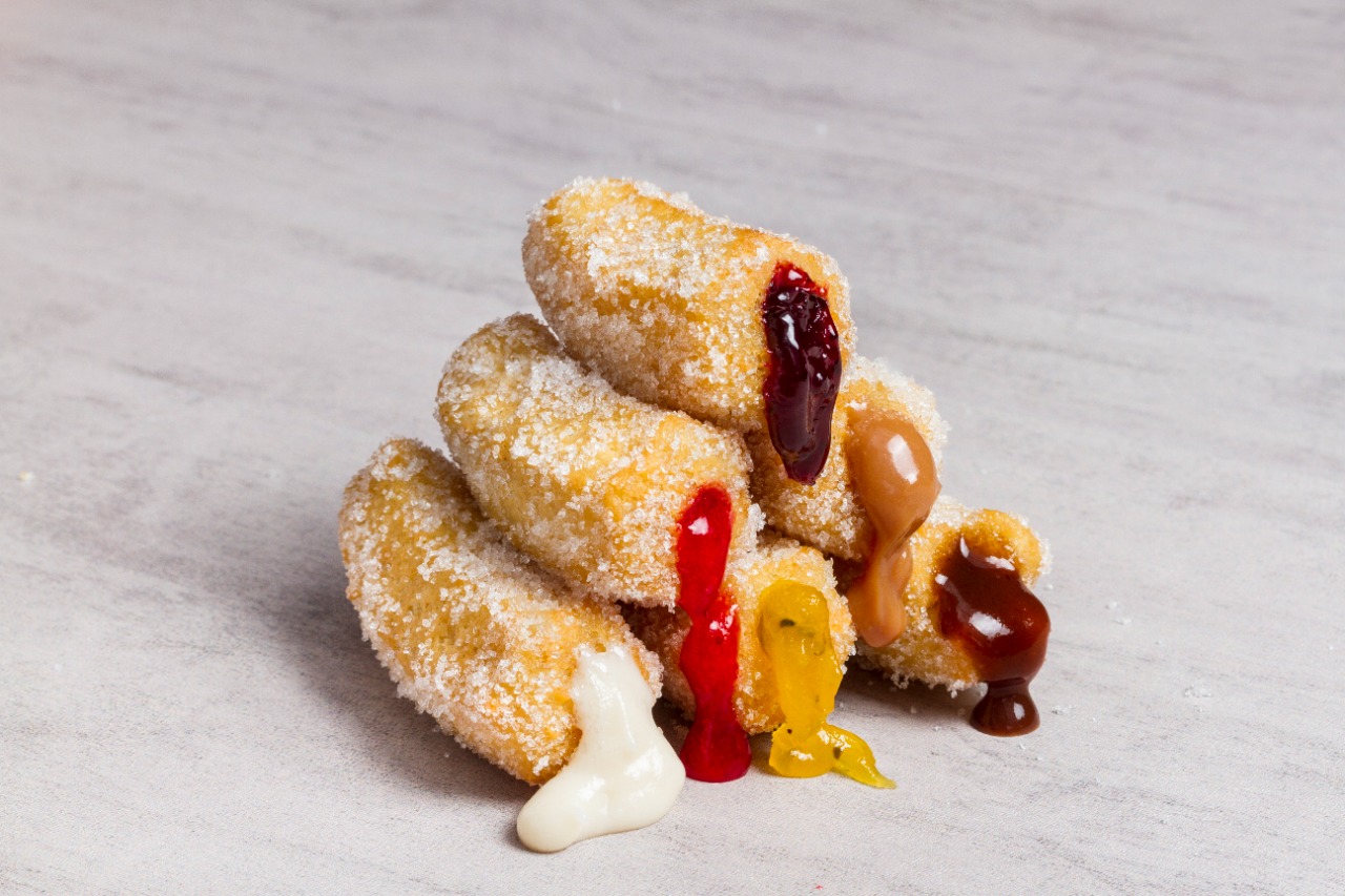 6 churros gruesos de 5 cm, azucarados y rellenos con salsas a elección