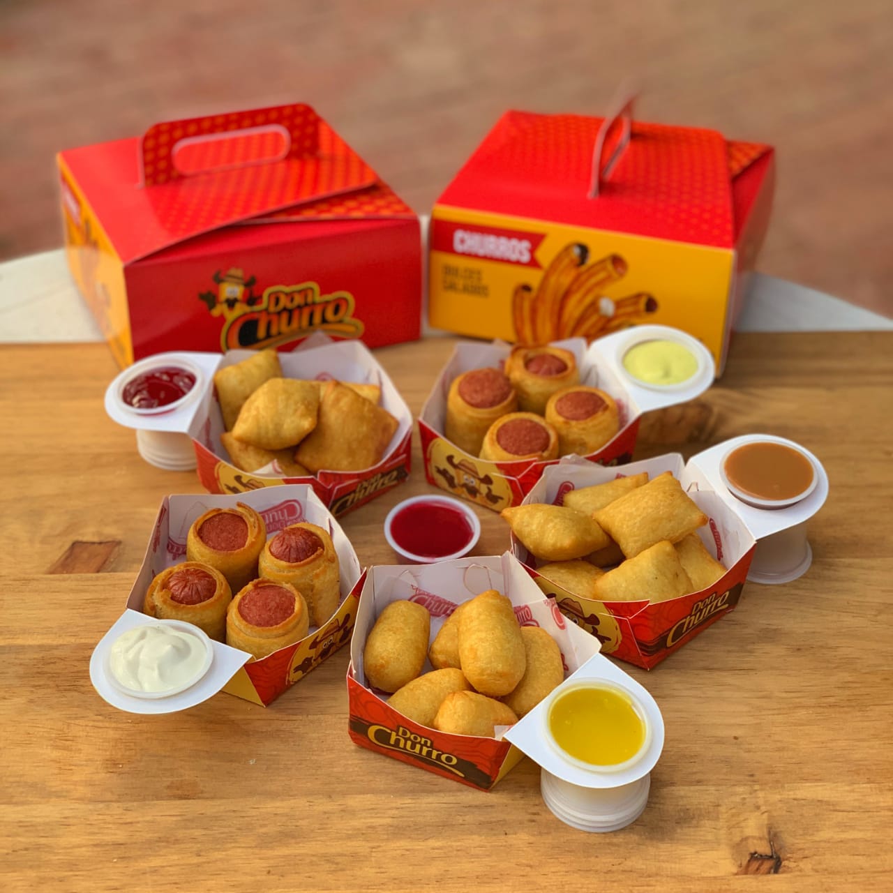 4 salchichas americanas gruesas de 5 cm, envueltas en una crujiente masa de churro y con una copa de 1/2 onza de salsa a elección.