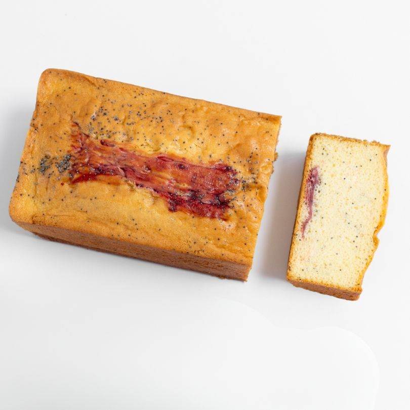 Torta casera de vainilla con semillas de amapola y salsa de mora, decorado con un delicioso y crocante streusel (10 porciones).