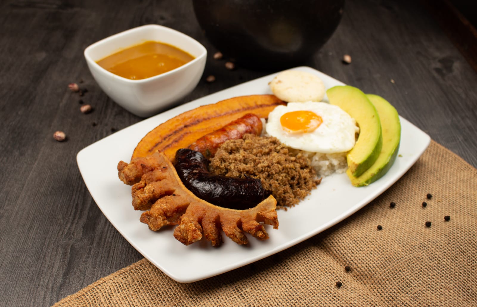 Carne desmechada, trozos de chicharrón, chorizo, maíz tierno, plátano maduro, aguacate, viruta de papa, arepa y arroz.