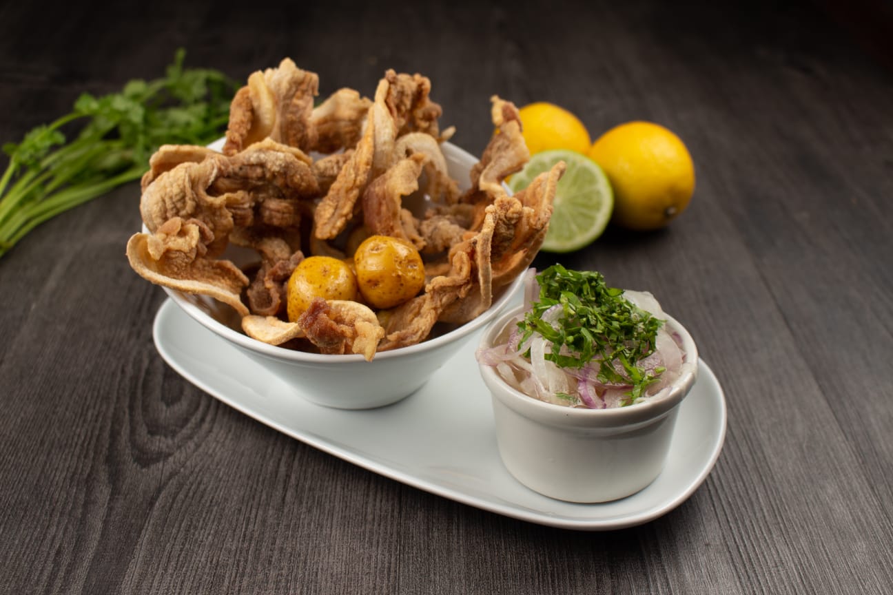 Lonjas de chicharrón crocante bañadas en zumo de limón con aros de cebolla y papitas criollas.