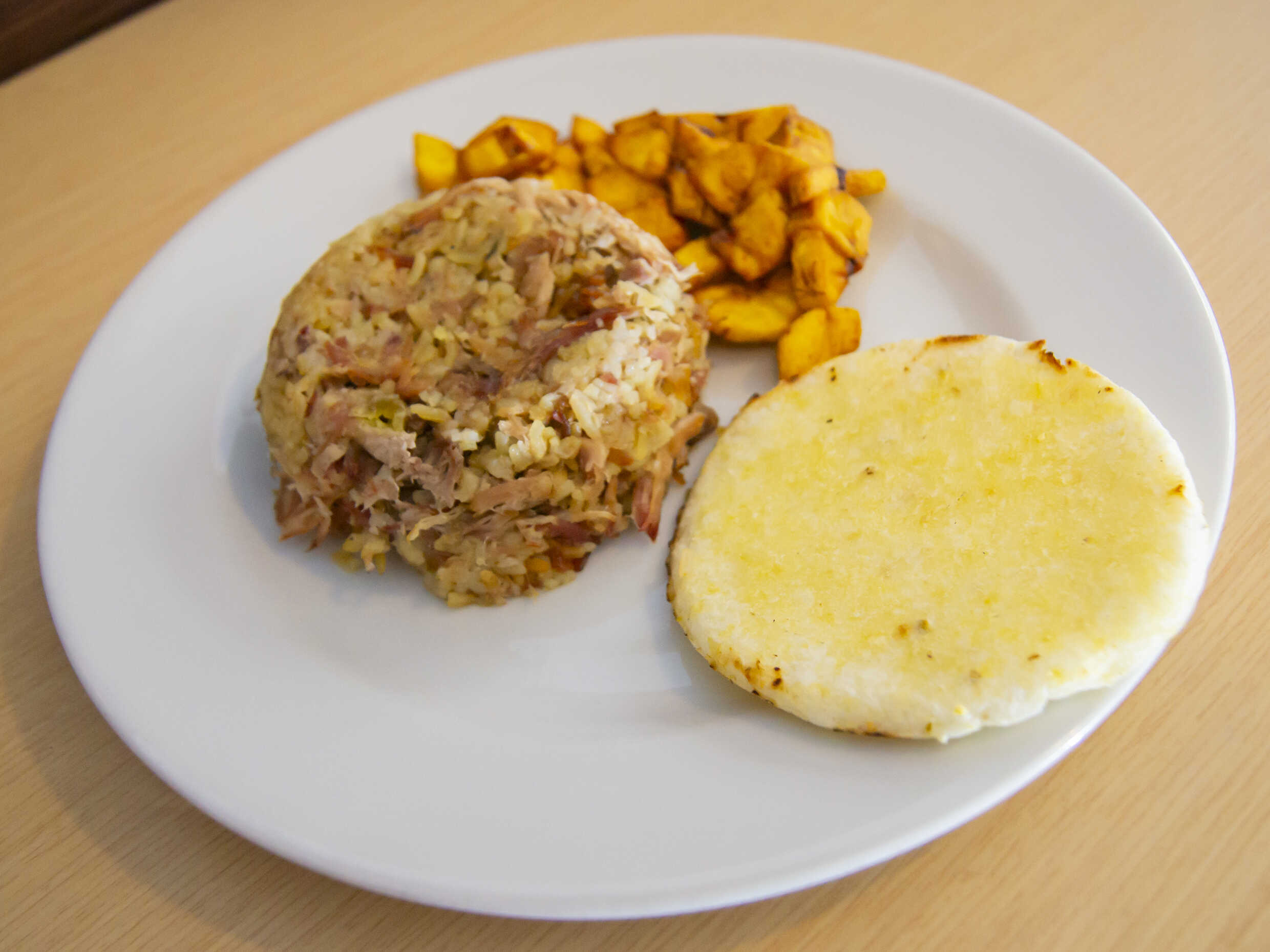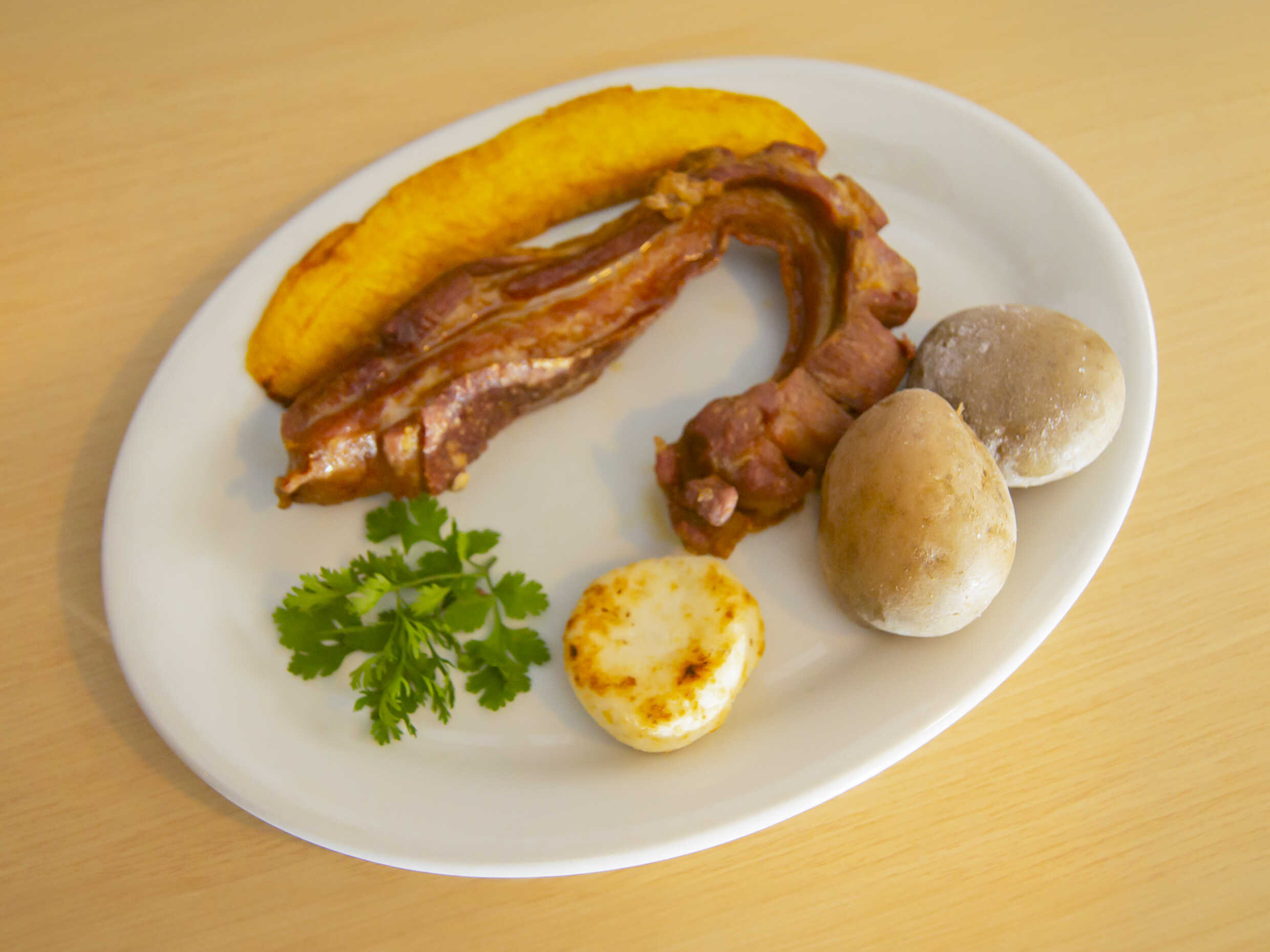 Acompañado de arepa de maíz, papa al vapor y tajada de maduro.