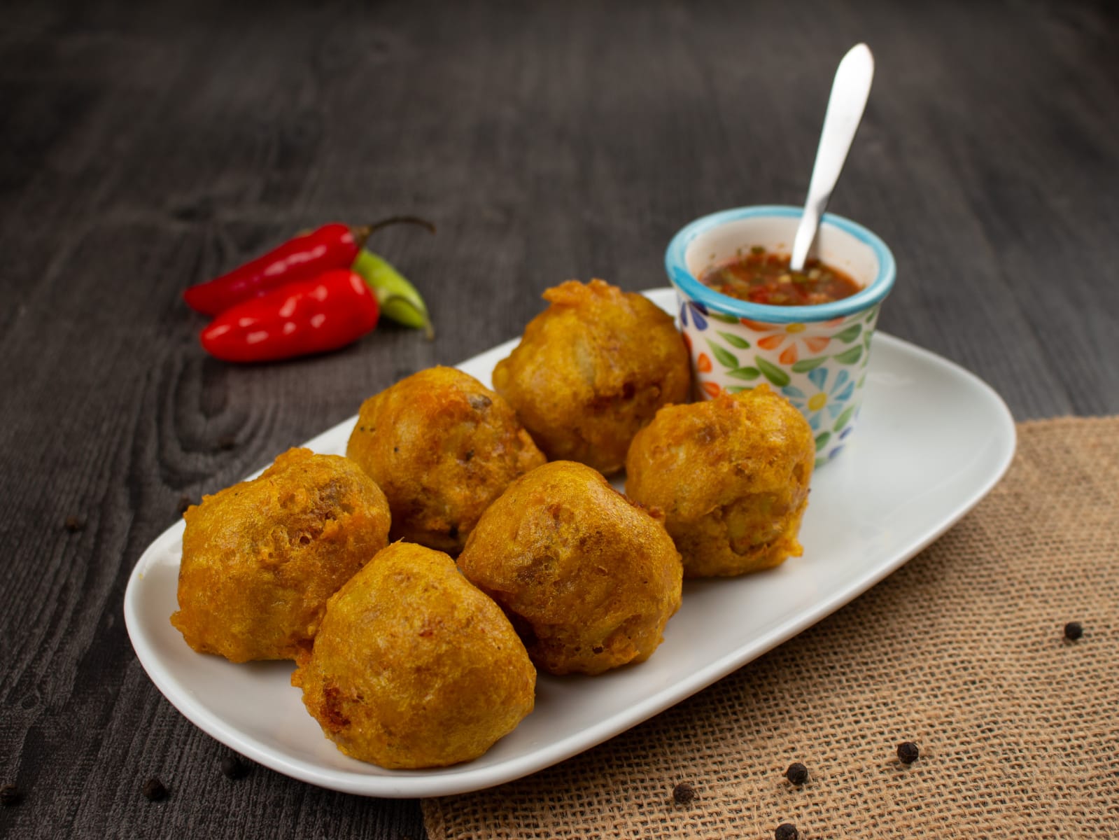 Papas rellenas servidas con ají casero